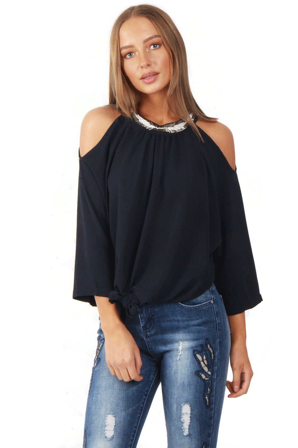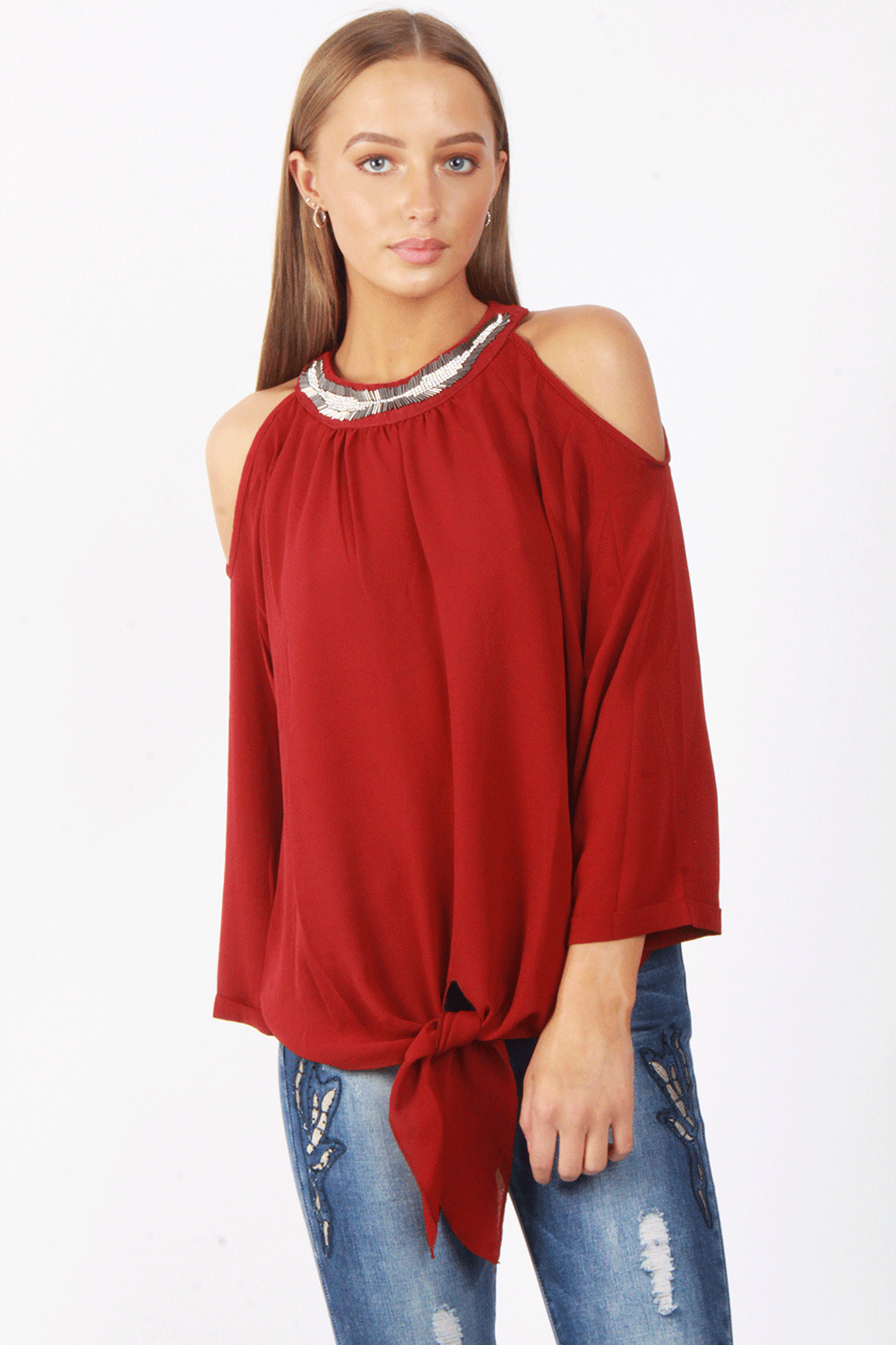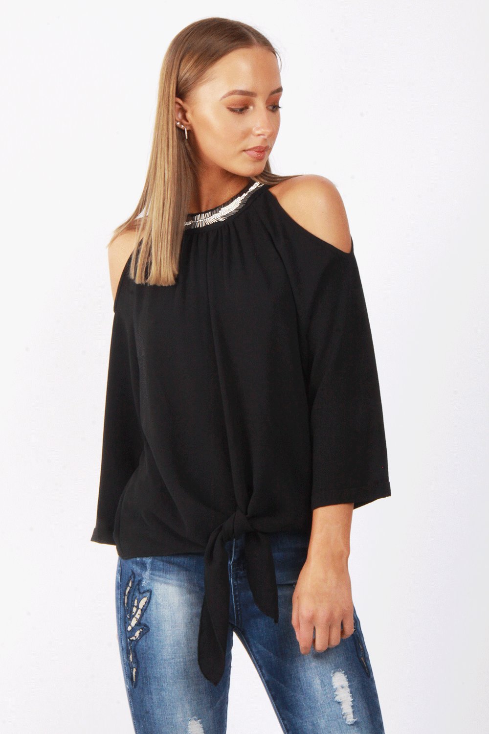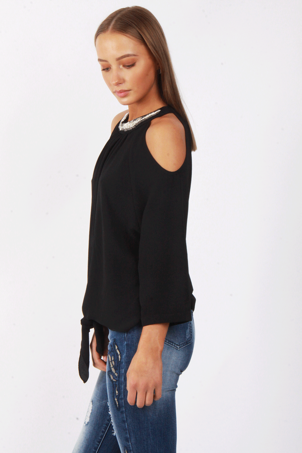 Embellished Jewel Neck Cold Shoulder Tie Front Blouse Top