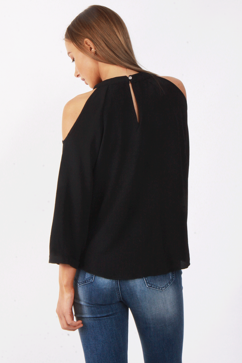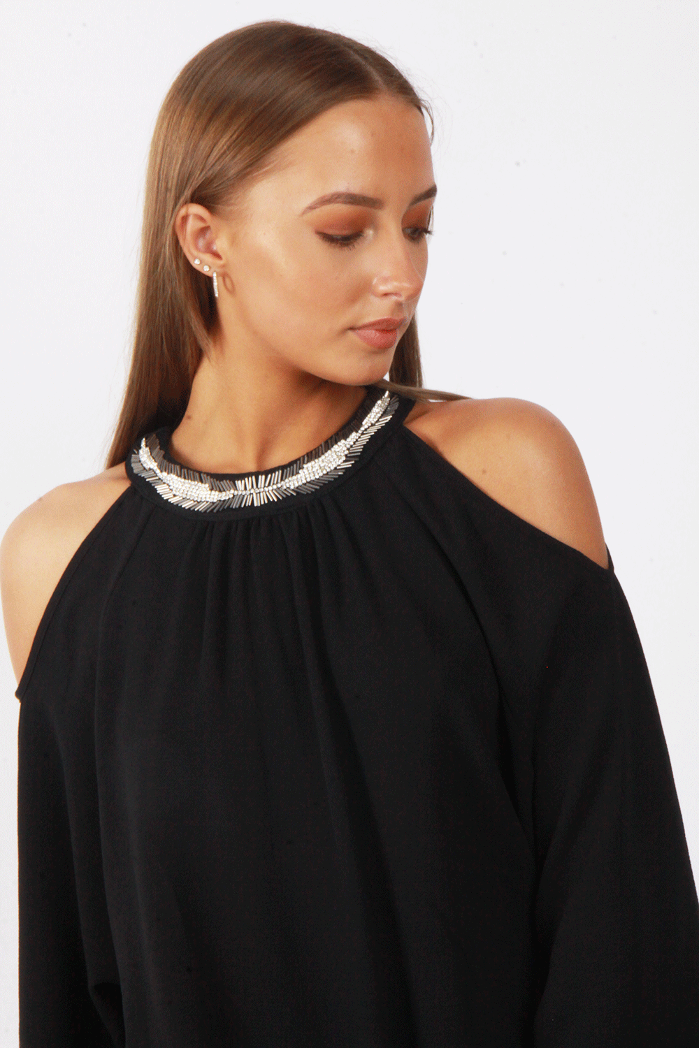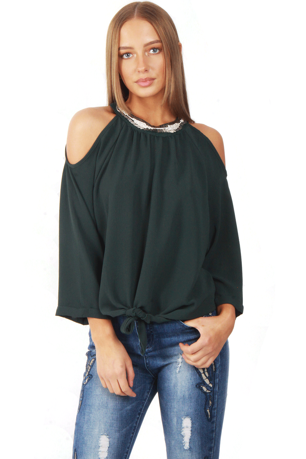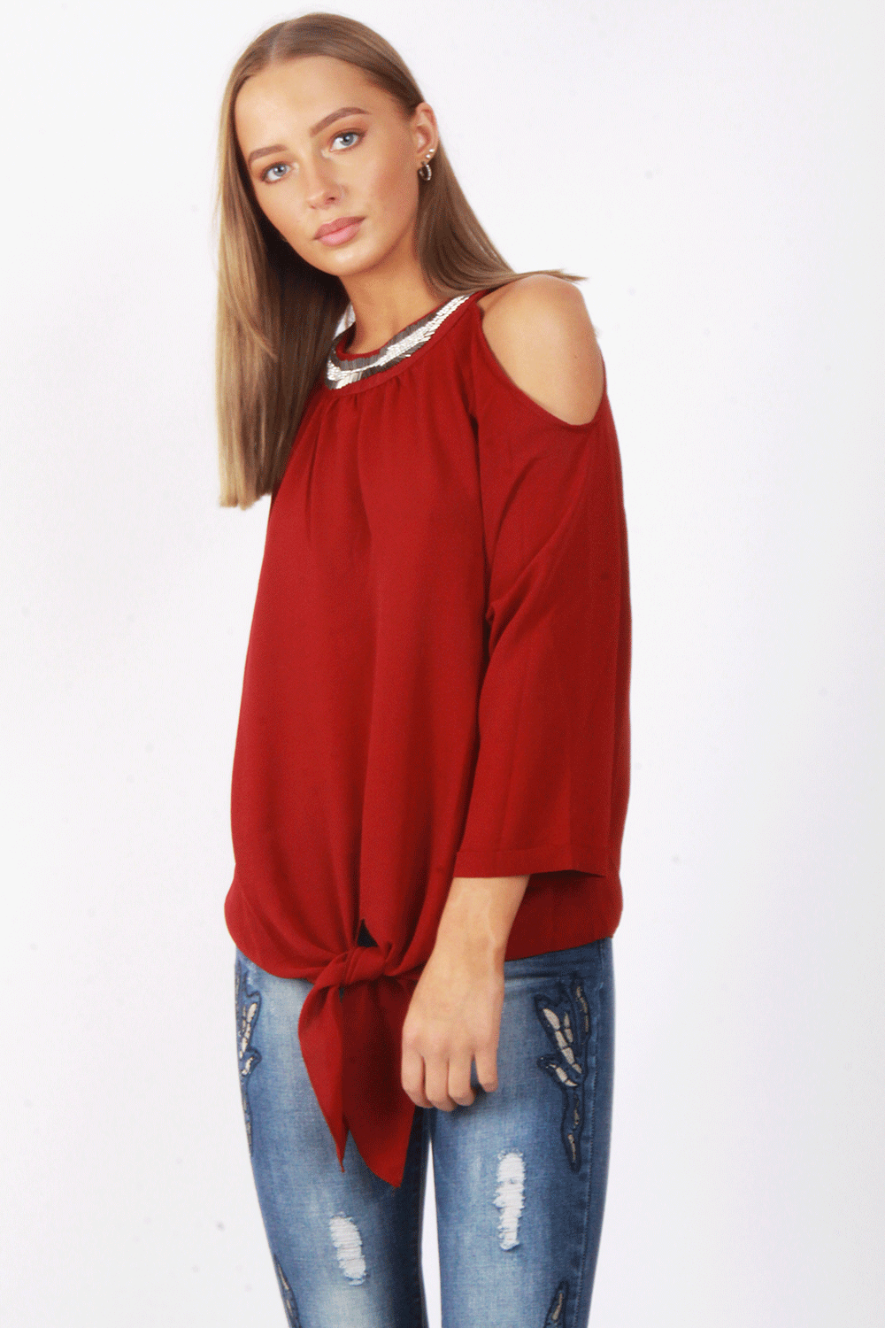 Embellished Jewel Neck Cold Shoulder Tie Front Blouse Top