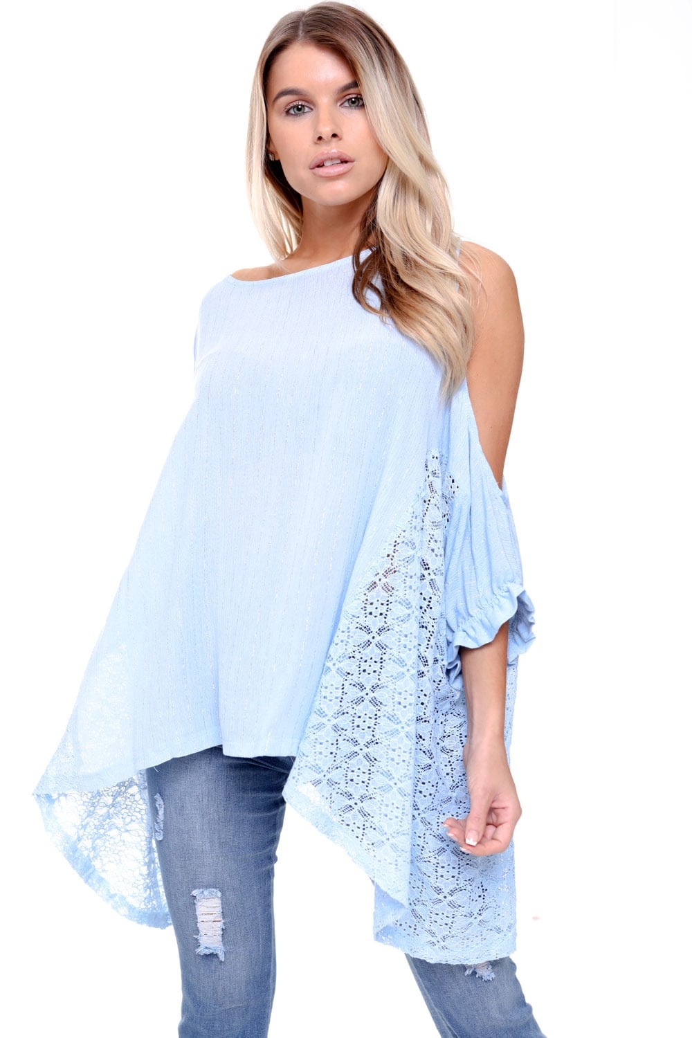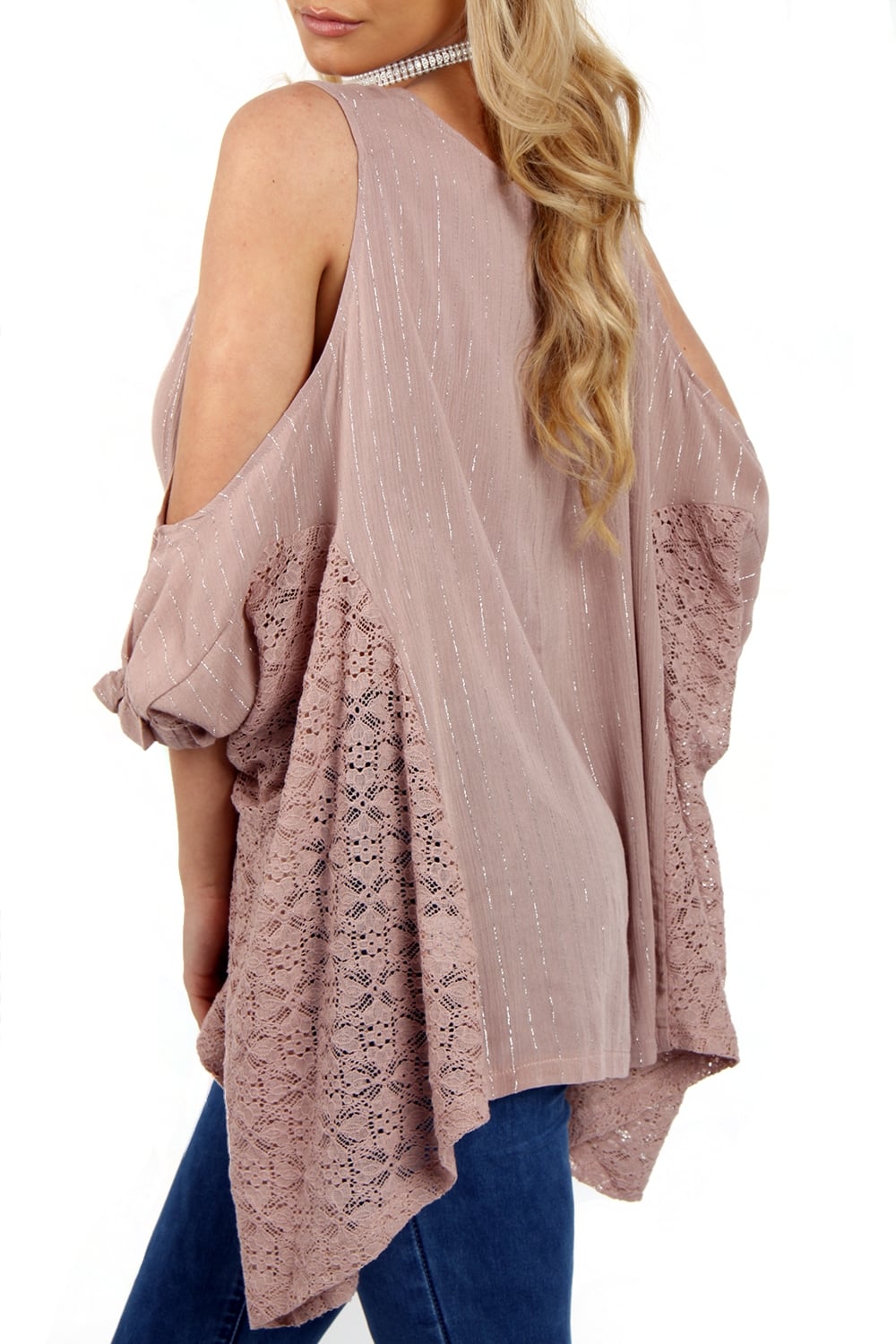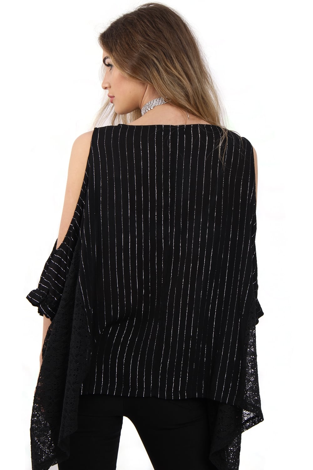 Pin Stripe Oversized Cold Shoulder Lace Insert Top