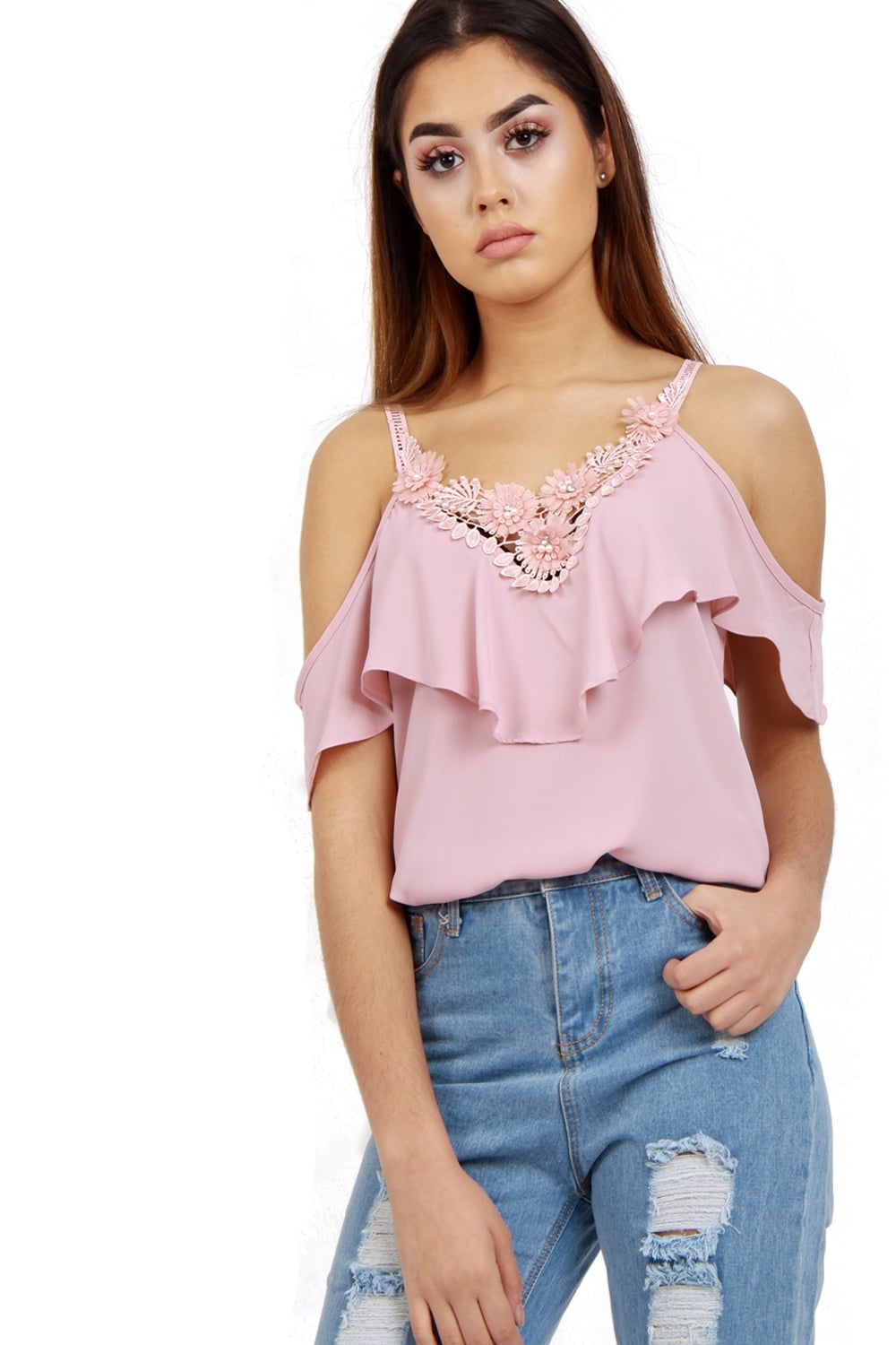 V Neck Floral Embellished Pearl Cami Cold Shoulder Top