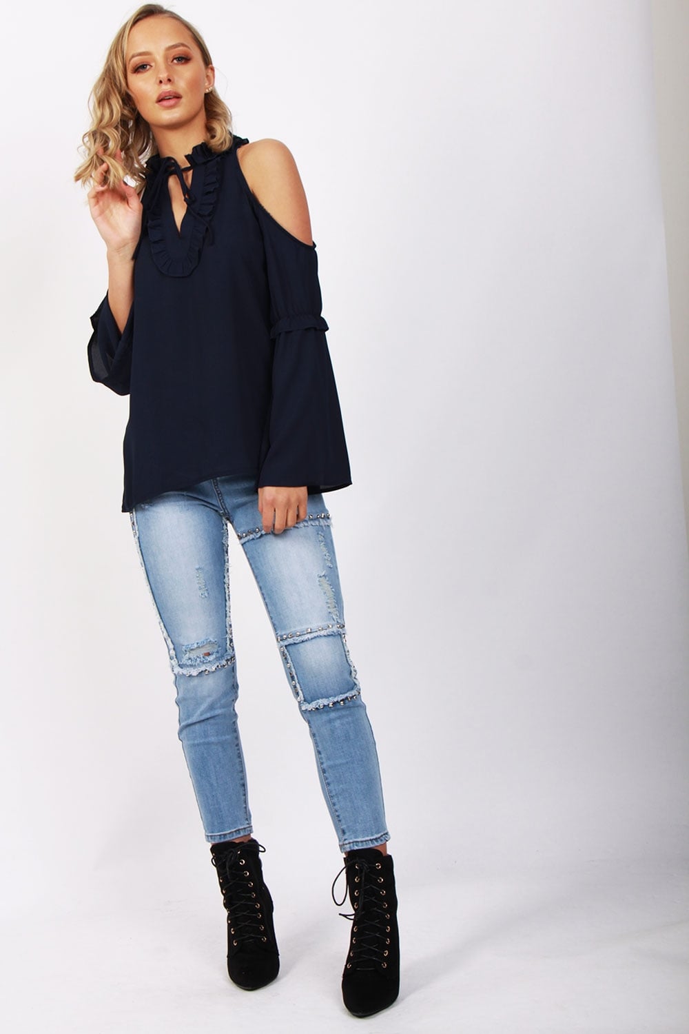 Ruffle Pleat Detail Cold Shoulder Flare Sleeve Blouse Top