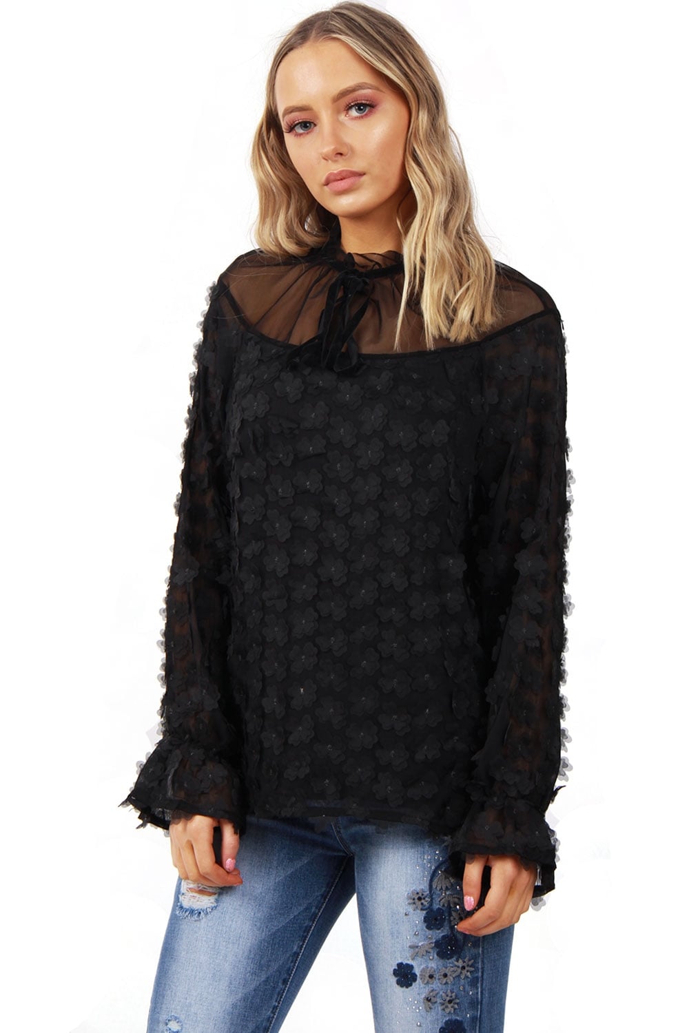 Flower Layered 3D Applique Ruffle Tie Neck Top