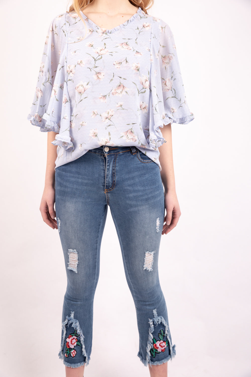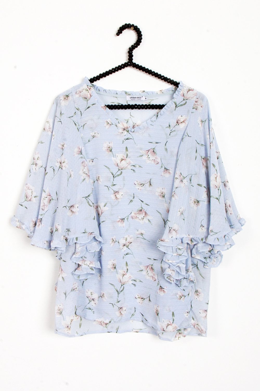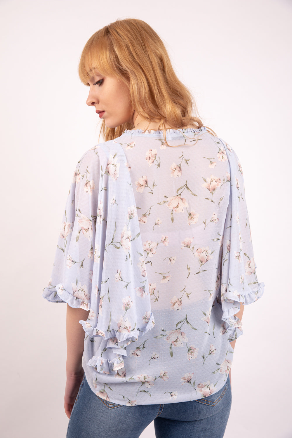 Powder Blue Floral Print Batwing Chiffon Blouse Top