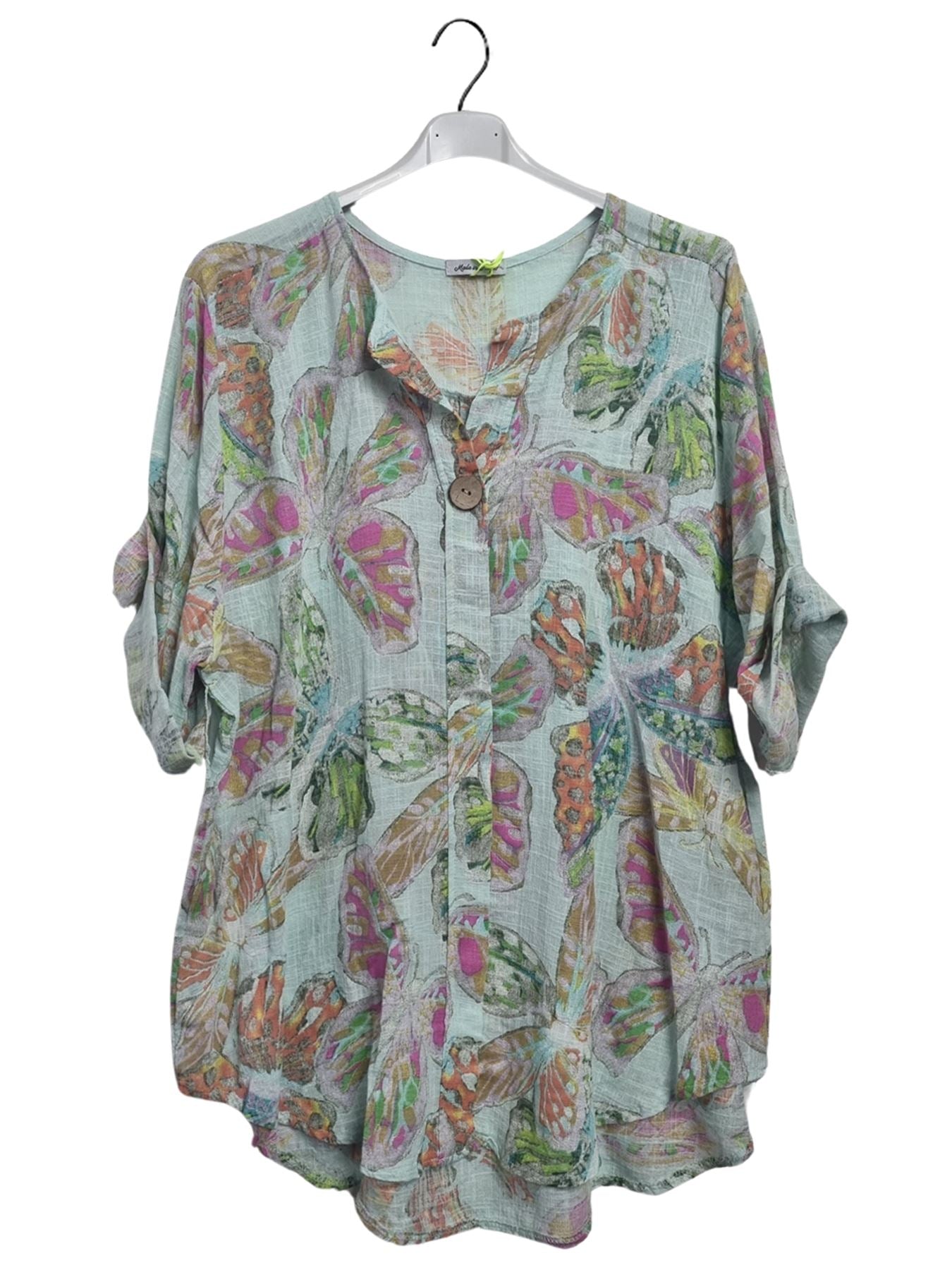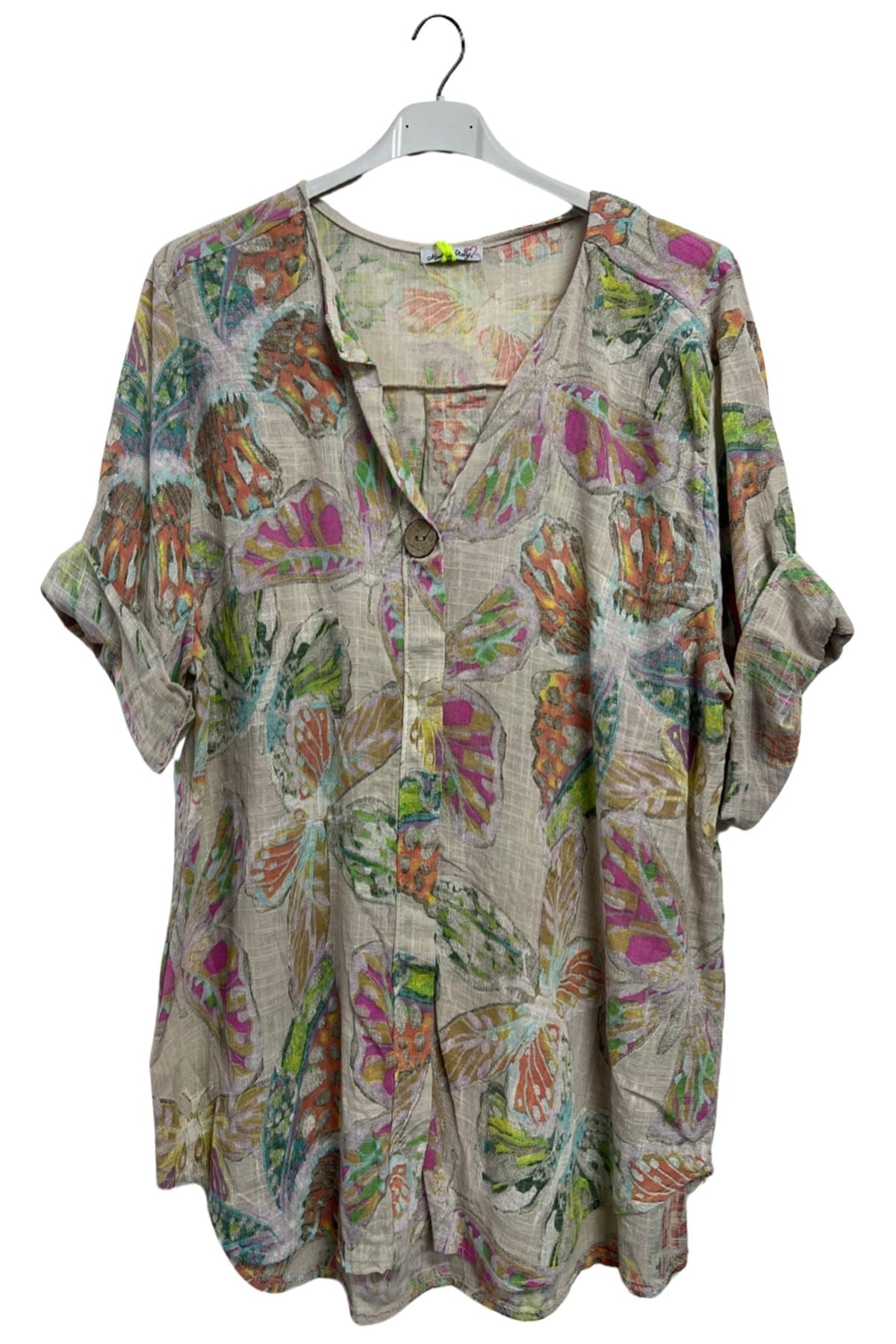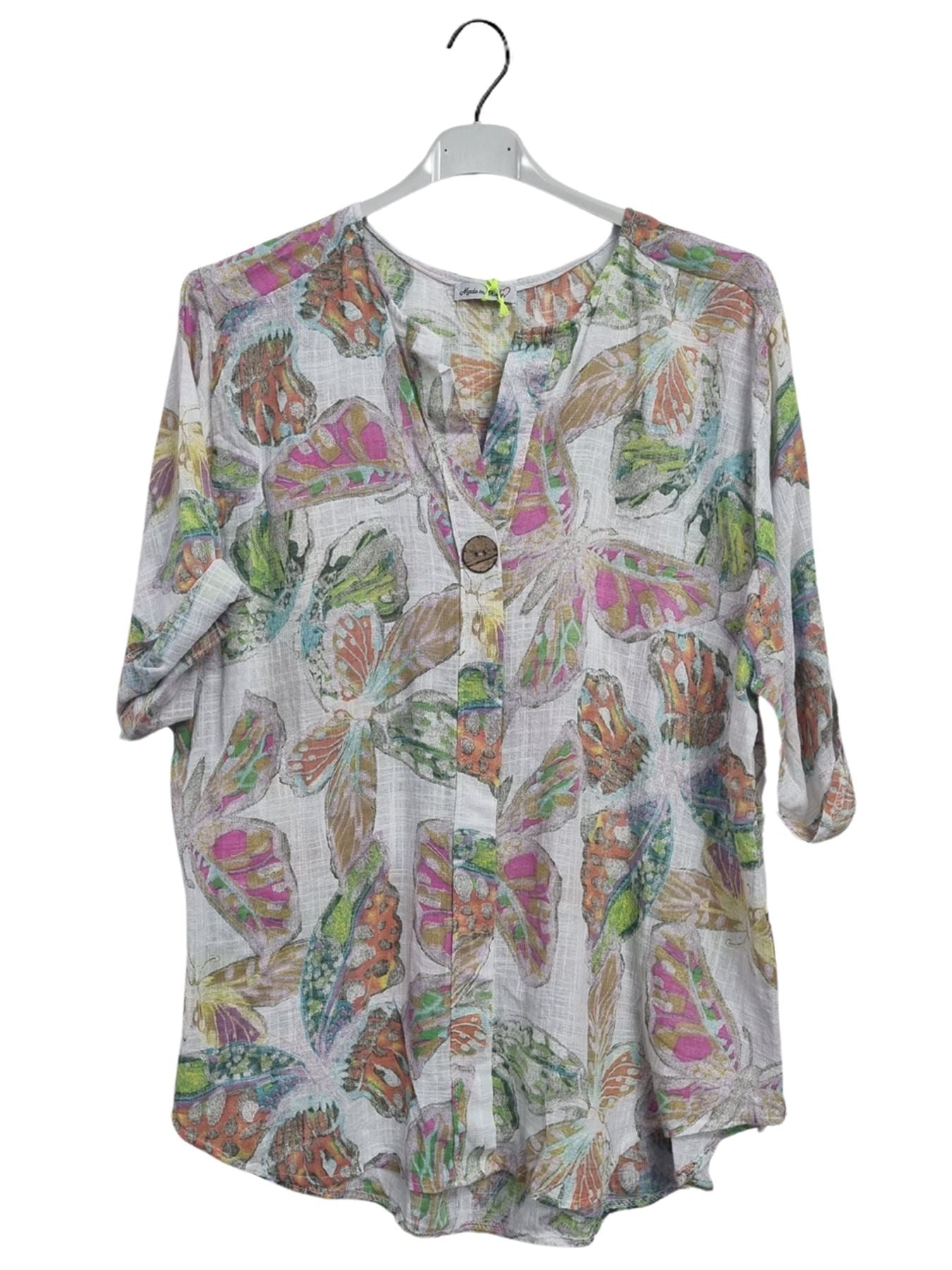 Step into effortless spring-summer style with this Italian cotton tunic, adorned with a whimsical butterfly-inspired print. Crafted from lightweight, breathable material, this top offers a loose, plus-size fit that drapes gracefully for all-day comfort. The notch V-neckline features a single button closure, adding a chic touch to this casual yet sophisticated piece. Designed with long sleeves that can be rolled up, it provides versatility for shifting temperatures, making it ideal for both warm afternoons and breezy evenings. The flowing silhouette enhances movement and flatters every figure, making it a perfect companion for leggings, jeans, or linen trousers. Whether you’re heading to a casual brunch or a relaxed outing, this tunic blends laid-back charm with effortless Italian fashion, ensuring you always look polished yet comfortable. A must-have for women who embrace style, comfort, and unique prints!