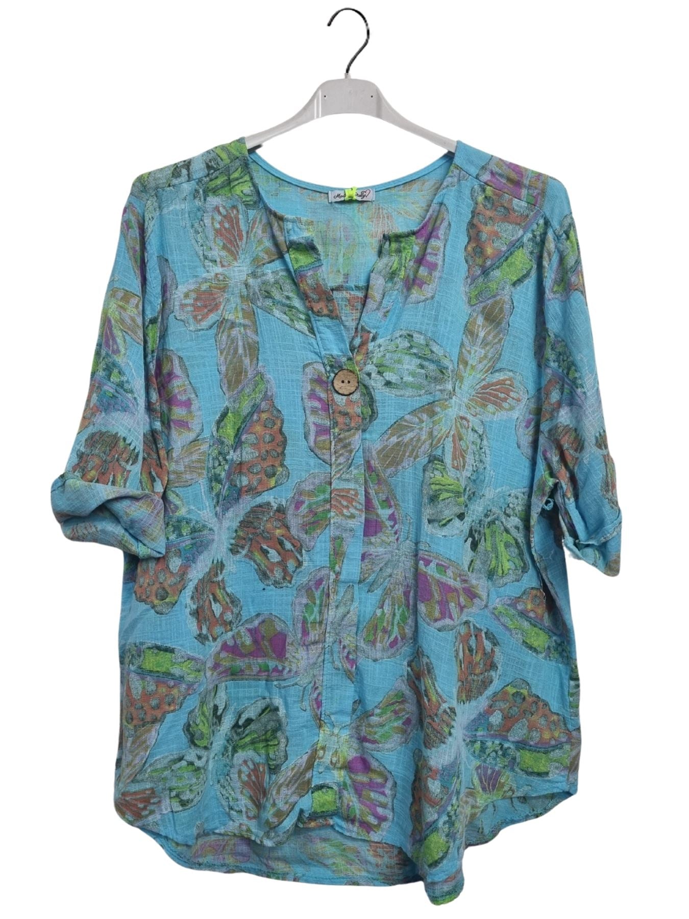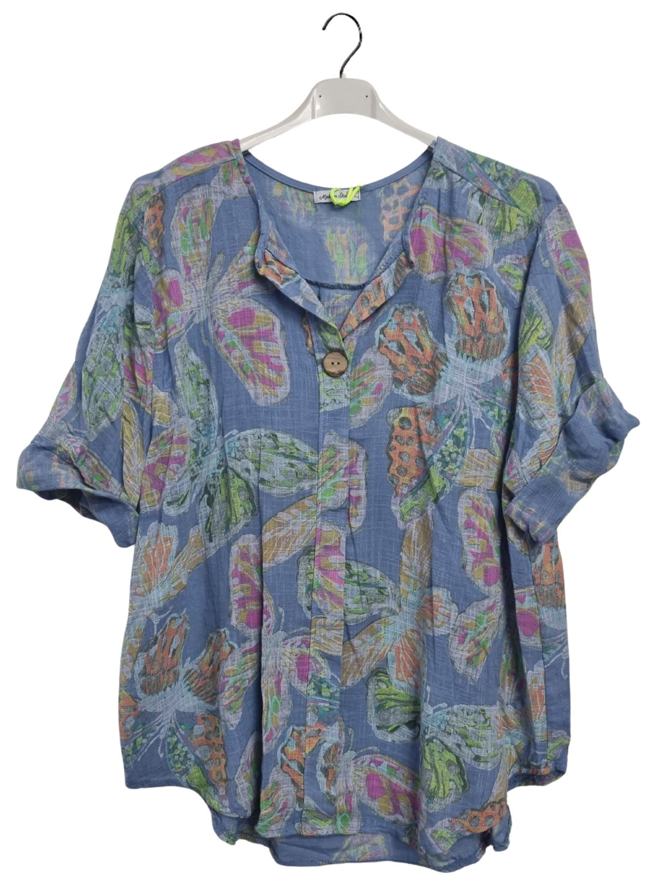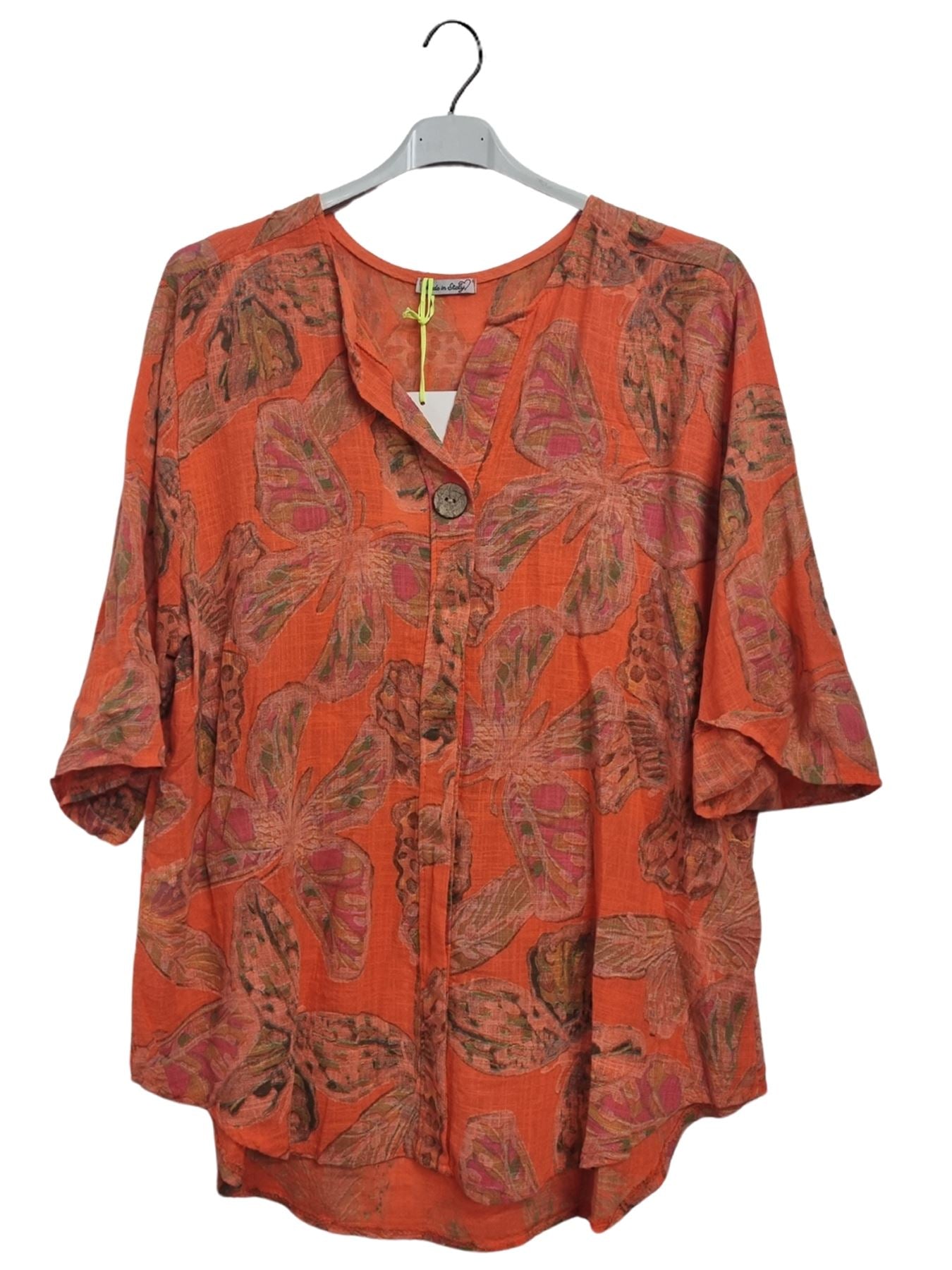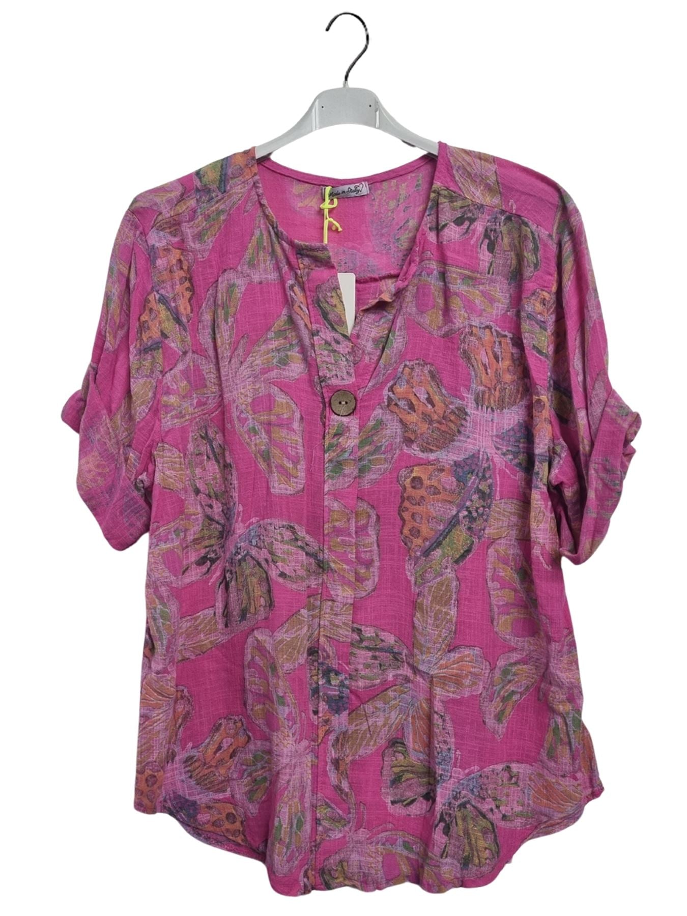 Step into effortless spring-summer style with this Italian cotton tunic, adorned with a whimsical butterfly-inspired print. Crafted from lightweight, breathable material, this top offers a loose, plus-size fit that drapes gracefully for all-day comfort. The notch V-neckline features a single button closure, adding a chic touch to this casual yet sophisticated piece. Designed with long sleeves that can be rolled up, it provides versatility for shifting temperatures, making it ideal for both warm afternoons and breezy evenings. The flowing silhouette enhances movement and flatters every figure, making it a perfect companion for leggings, jeans, or linen trousers. Whether you’re heading to a casual brunch or a relaxed outing, this tunic blends laid-back charm with effortless Italian fashion, ensuring you always look polished yet comfortable. A must-have for women who embrace style, comfort, and unique prints!