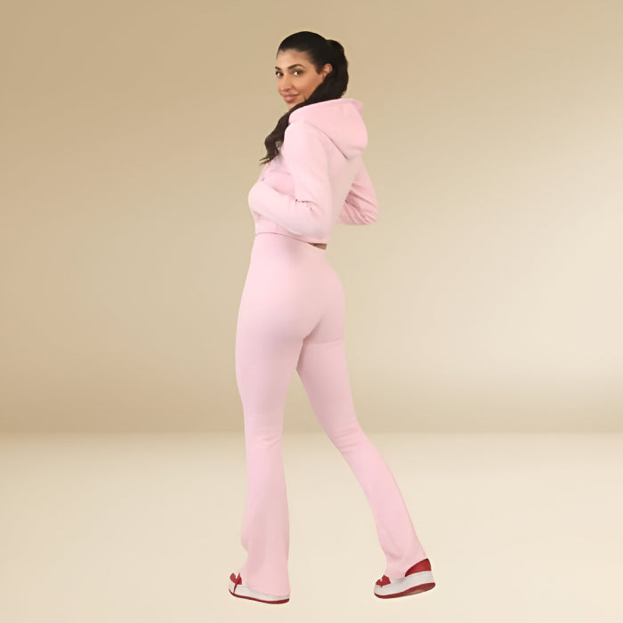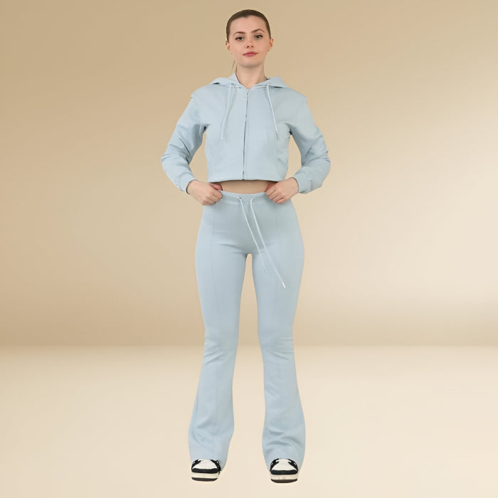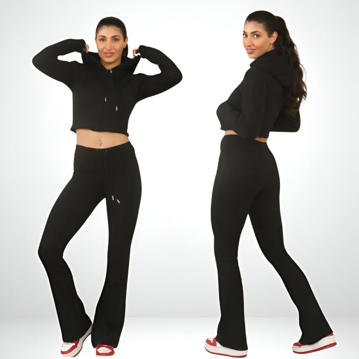Cropped zip-up hoodie for a stylish, casual look High-waisted bell bottom trousers for a flattering silhouette Soft and stretchy cotton blend for all-day comfort Perfect for lounging, casual wear, or athleisure styling Machine washable and easy to maintain