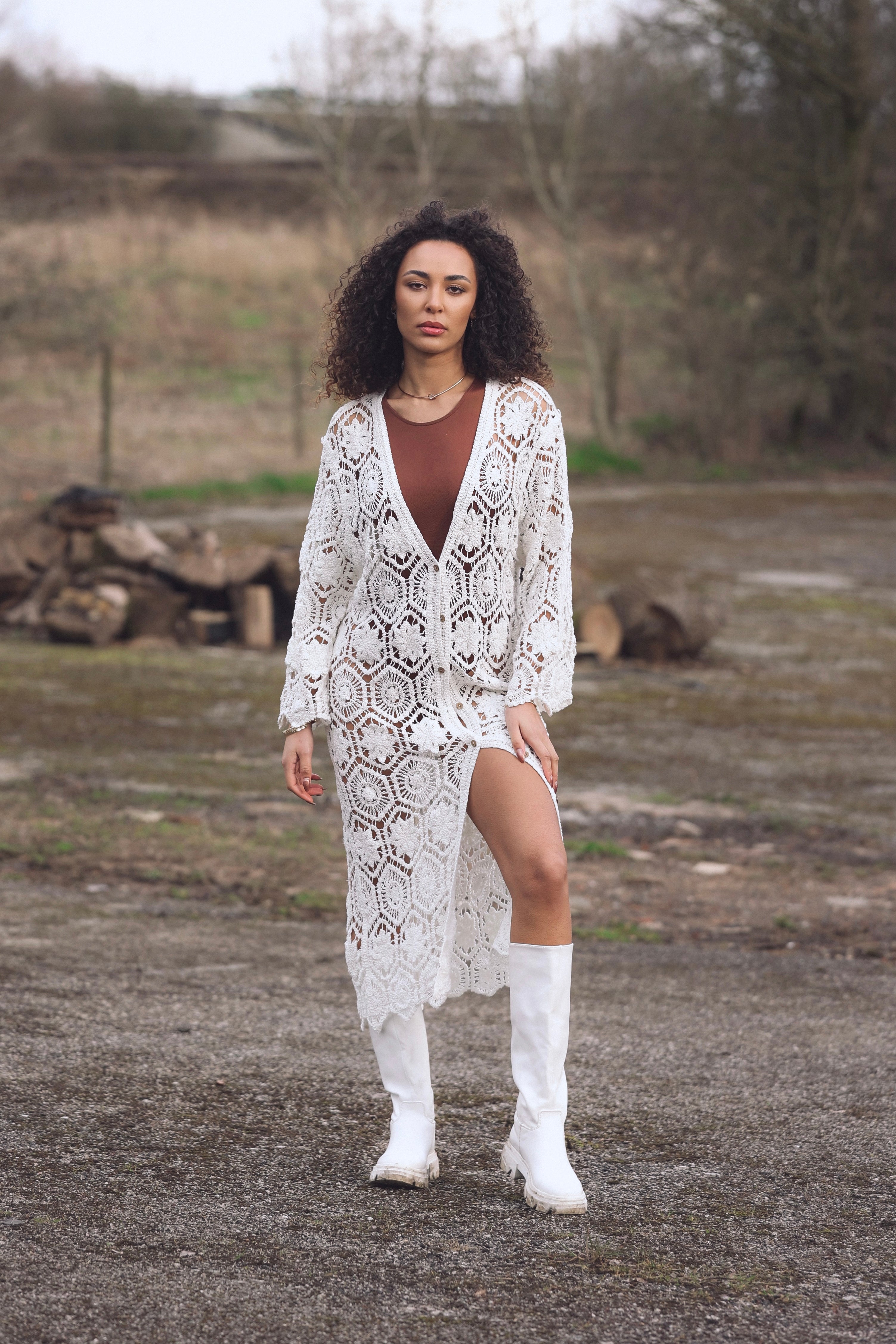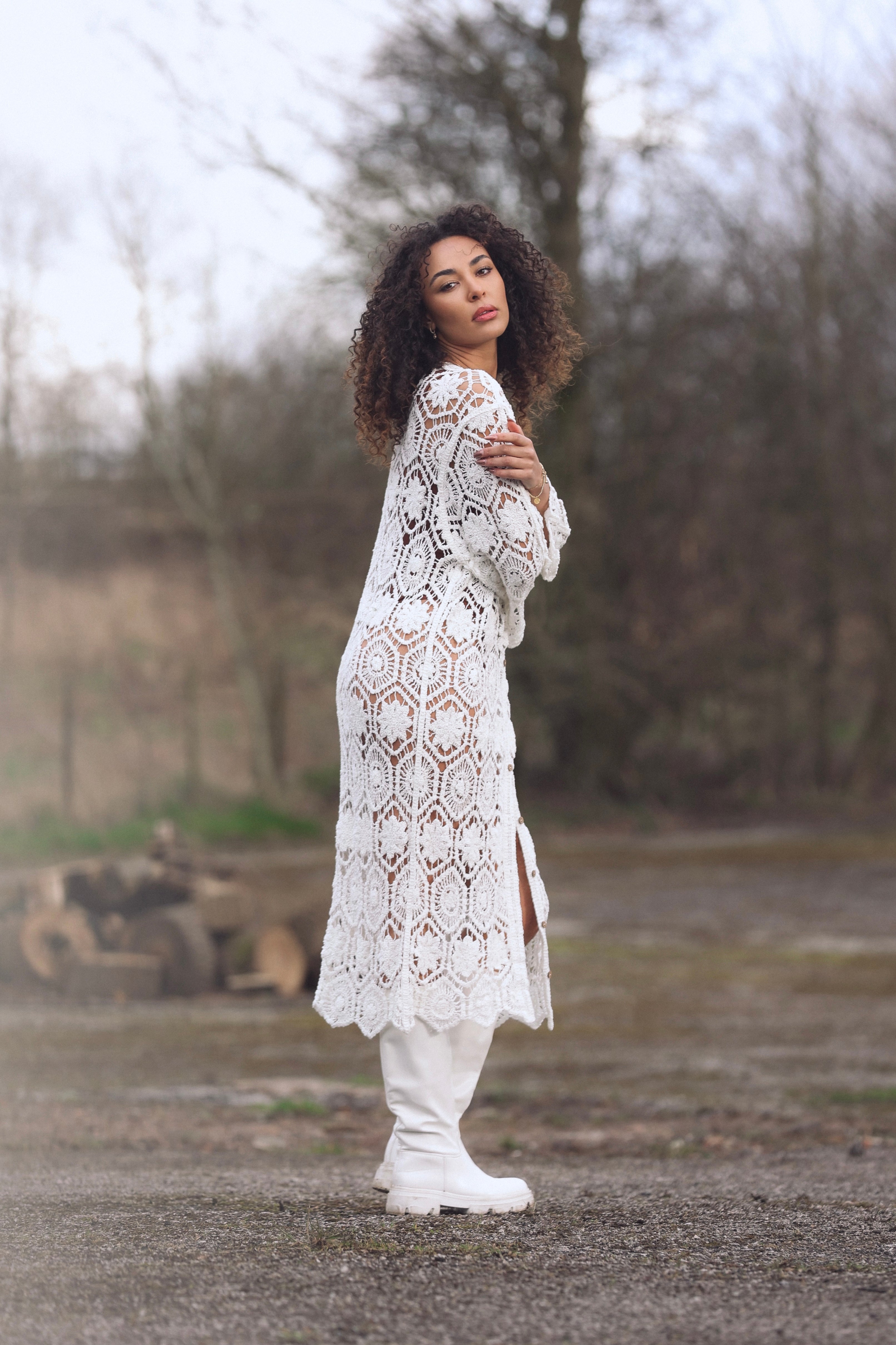 Wrap yourself in effortless elegance with this Italian cotton oversized cardigan, a must-have for spring and summer layering. Featuring a delicate floral crochet pattern, this cardigan exudes a touch of vintage charm while maintaining a lightweight and breathable feel. The dip V-neckline enhances the relaxed silhouette, making it easy to layer over casual or dressy outfits. Designed for versatility, the button-closing front allows for adjustable styling, whether worn open for a breezy feel or buttoned up for a more structured look. The long sleeves provide comfort while complementing the plus-size loose fit, ensuring ease of movement. Whether paired with jeans and a simple top for a casual outing or layered over a dress for an elegant touch, this cardigan adds a refined yet relaxed element to any wardrobe. Flowing, stylish, and effortlessly chic, it’s the perfect finishing touch for boho-inspired fashion lovers.