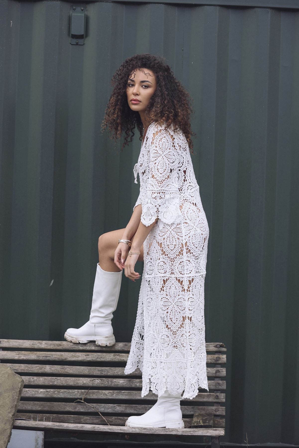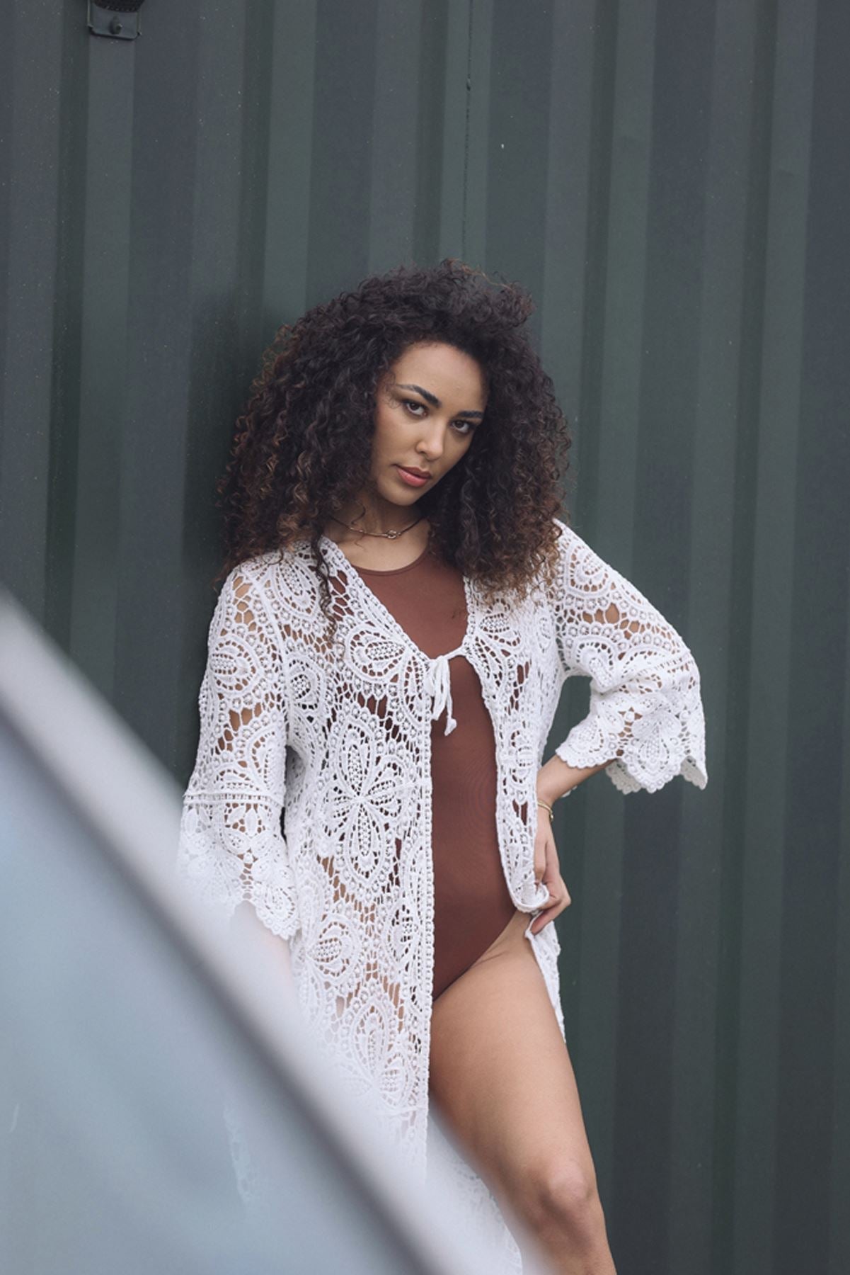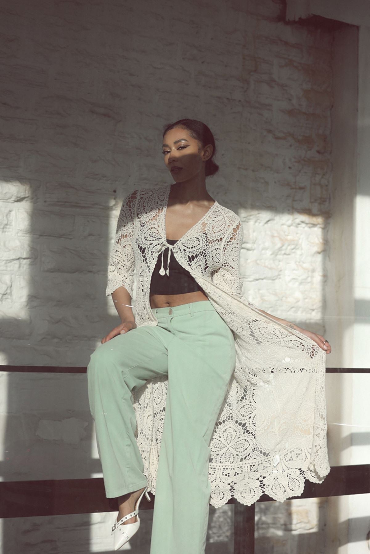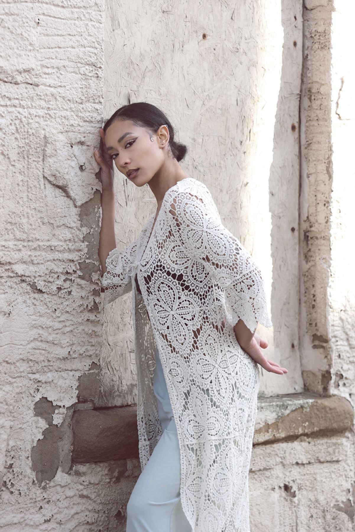 Add a touch of bohemian charm to your wardrobe with this Italian cotton oversized long cardigan, perfect for spring and summer layering. The exquisite floral crochet pattern showcases delicate craftsmanship, adding a romantic and airy feel to this piece. Designed with a flattering V-neckline, it drapes beautifully over any outfit, while the drawstring fastening allows for an adjustable fit. The long flared sleeves create a graceful and flowing silhouette, enhancing its effortless elegance. Whether worn open over a casual daytime outfit or cinched for a structured look, this cardigan offers endless styling possibilities. Its breathable cotton fabric ensures comfort, making it ideal for layering over dresses, camisoles, or lightweight tops. Whether you're strolling by the beach, attending a garden brunch, or simply elevating your everyday style, this plus-size loose-fit cardigan brings a sophisticated and relaxed touch to any ensemble.