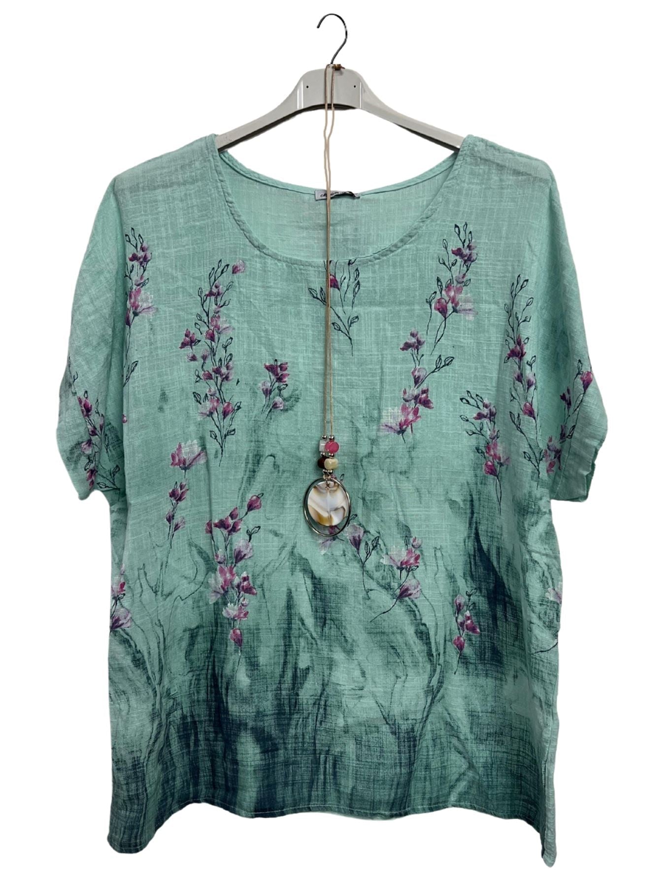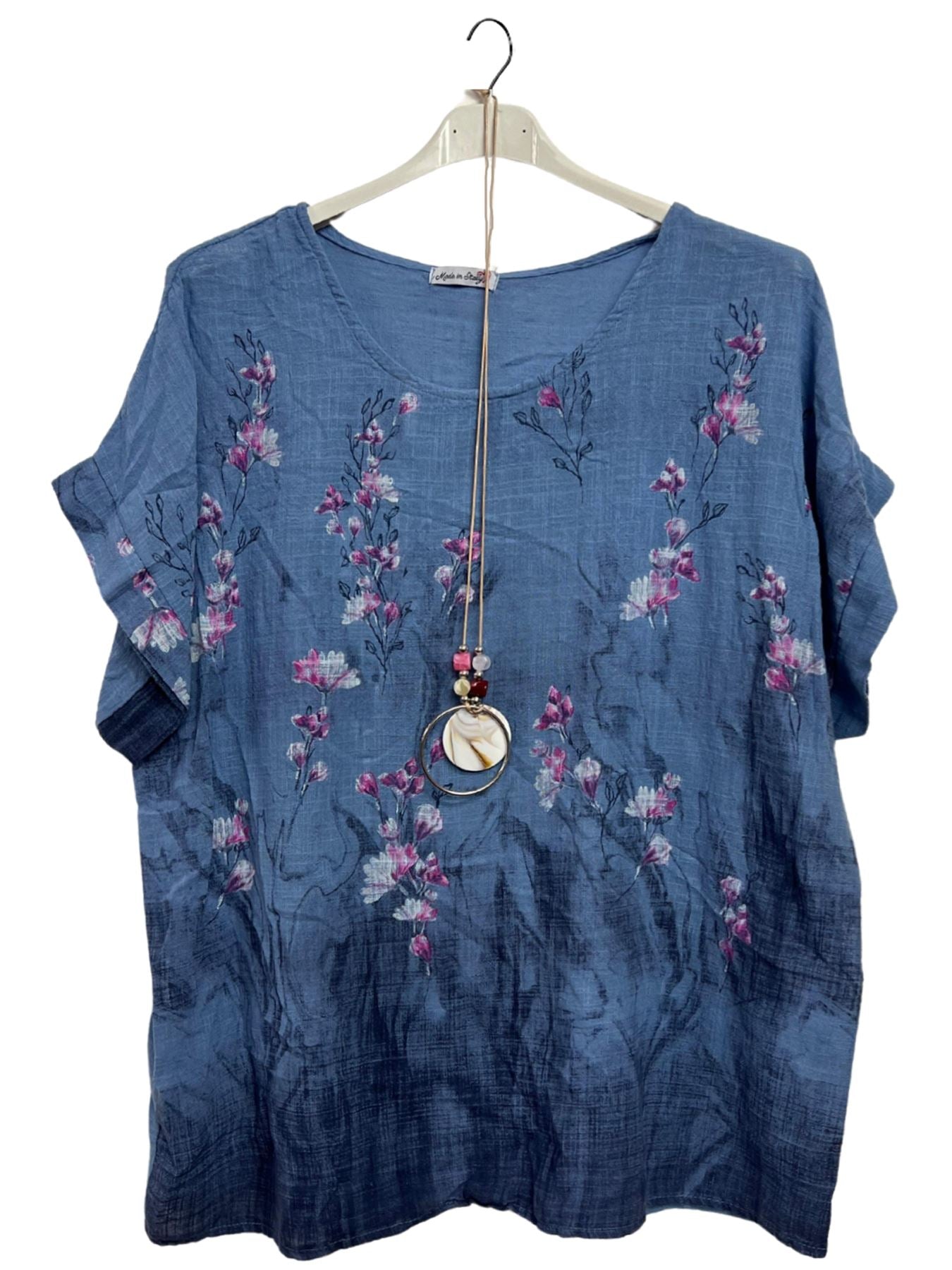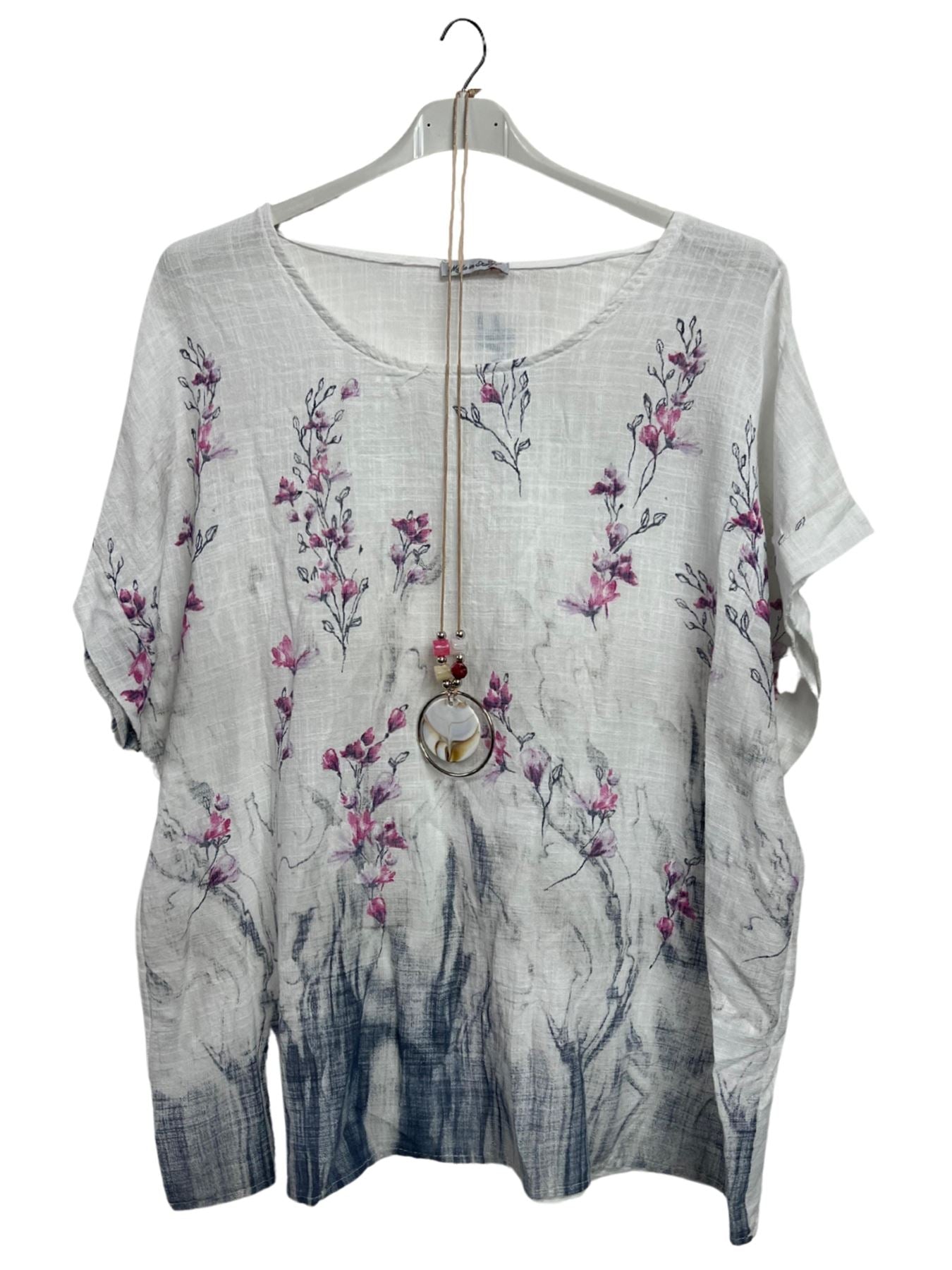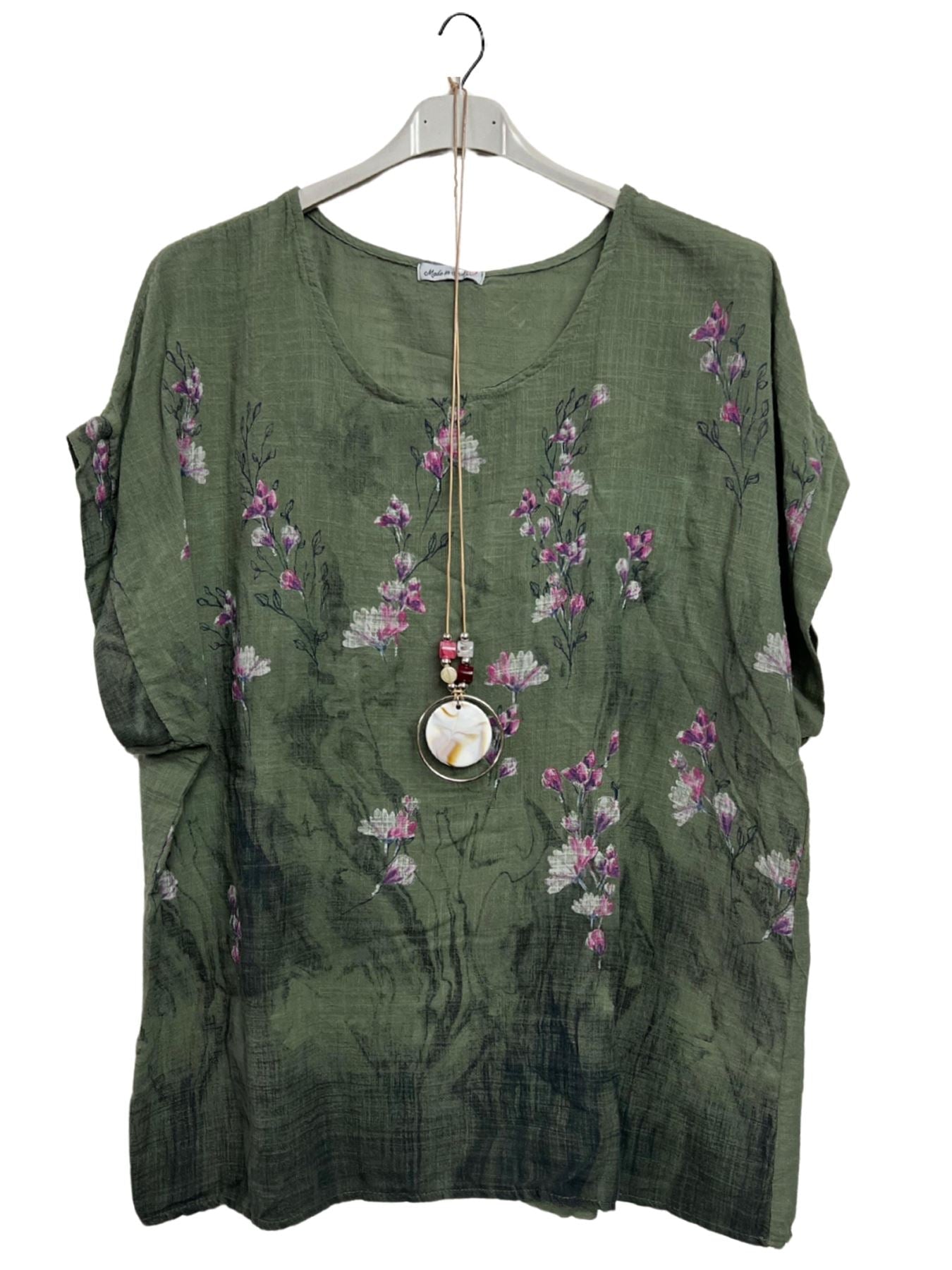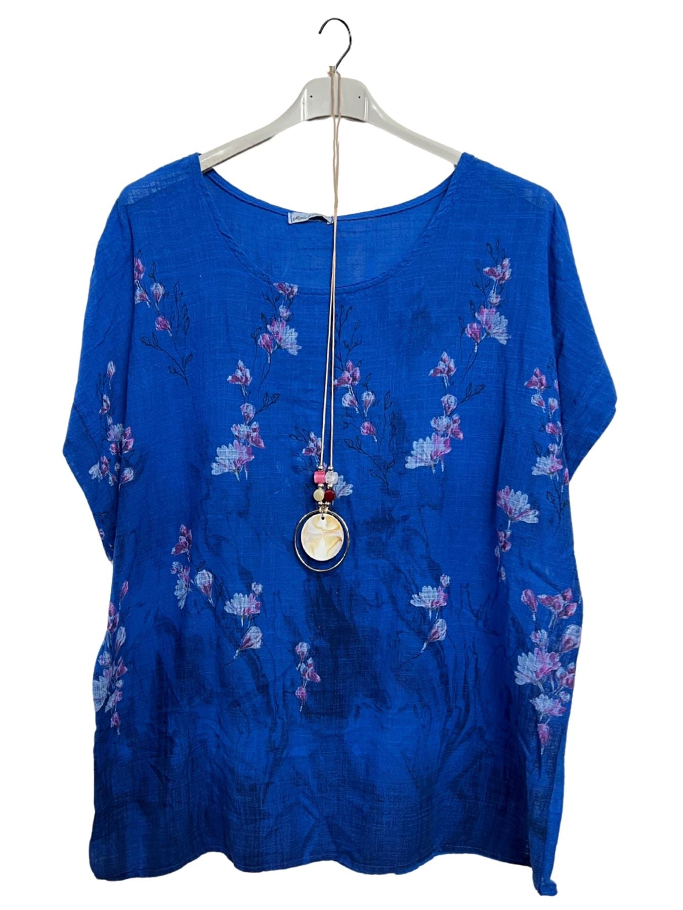 Step into effortless elegance with this Italian cotton floral print tunic top, designed to bring freshness to your wardrobe. The round neckline offers a timeless appeal, while the short sleeves keep it light and breezy for warm-weather days. Crafted from soft, breathable cotton, this tunic ensures all-day comfort in a plus-size, loose-fit silhouette that flatters every shape. The delicate floral print adds a touch of feminine charm, making it perfect for casual outings or relaxed weekends. A stylish necklace detail enhances the neckline, offering an instant accessorized look. Ideal for spring and summer, this tunic pairs beautifully with leggings, jeans, or linen trousers for a chic yet relaxed ensemble. Whether you're strolling through the city or enjoying a sunny day outdoors, this top is your go-to piece for effortless style and comfort.
