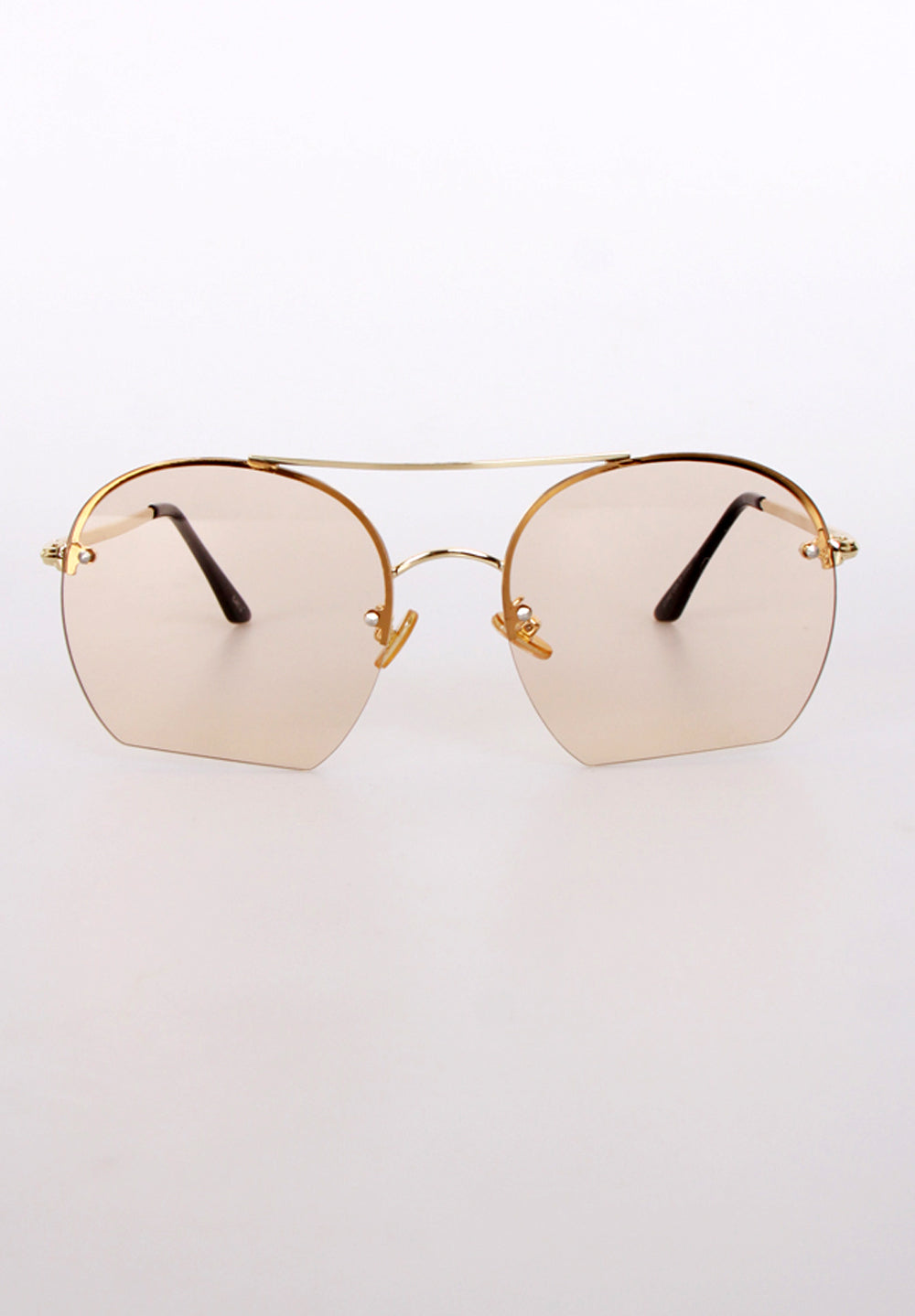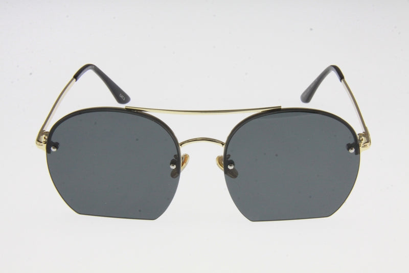 Make a retro-modern statement with these Gold Metal Frame Bridge Flat Bottom Sunglasses. Featuring a sleek gold metal frame with a unique double-bridge design and distinctive flat-bottom lenses, these sunglasses offer a contemporary twist on a vintage-inspired look. The tinted lenses provide UV protection while the lightweight frame ensures comfortable wear. Perfect for adding a touch of bold style to any outfit.