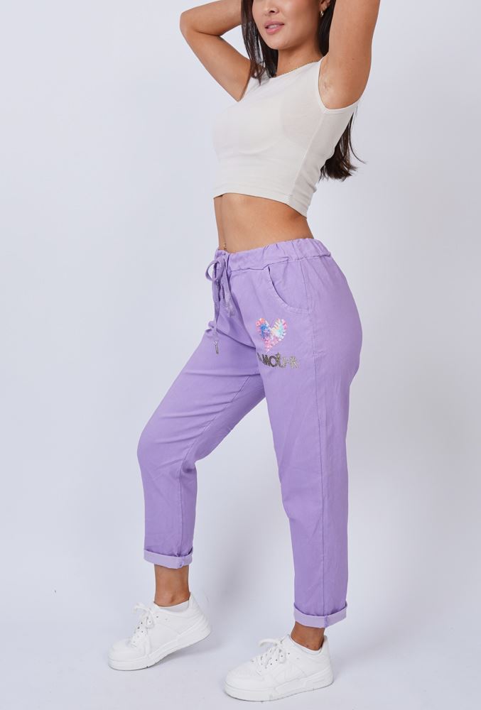 Elevate your casual ensemble with these Italian-designed pants for women. Crafted from luxurious viscose, they feature a charming heart motif, perfect for spring and summer. Plus-sized and boasting a loose fit, these pants offer comfort with an elasticated waistband, drawstring magic, and practical pockets. Open hems add a chic touch.