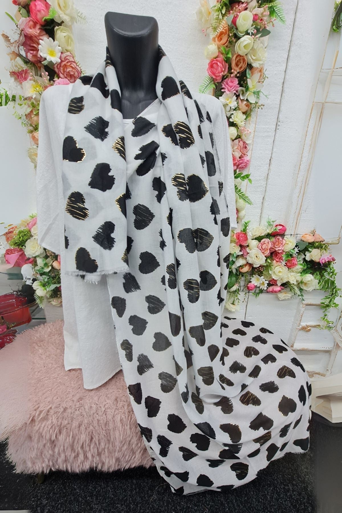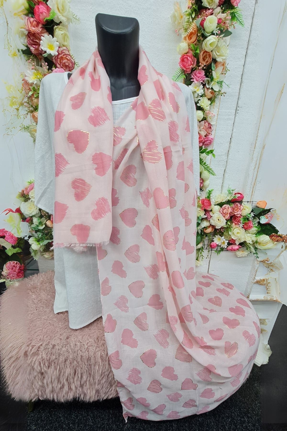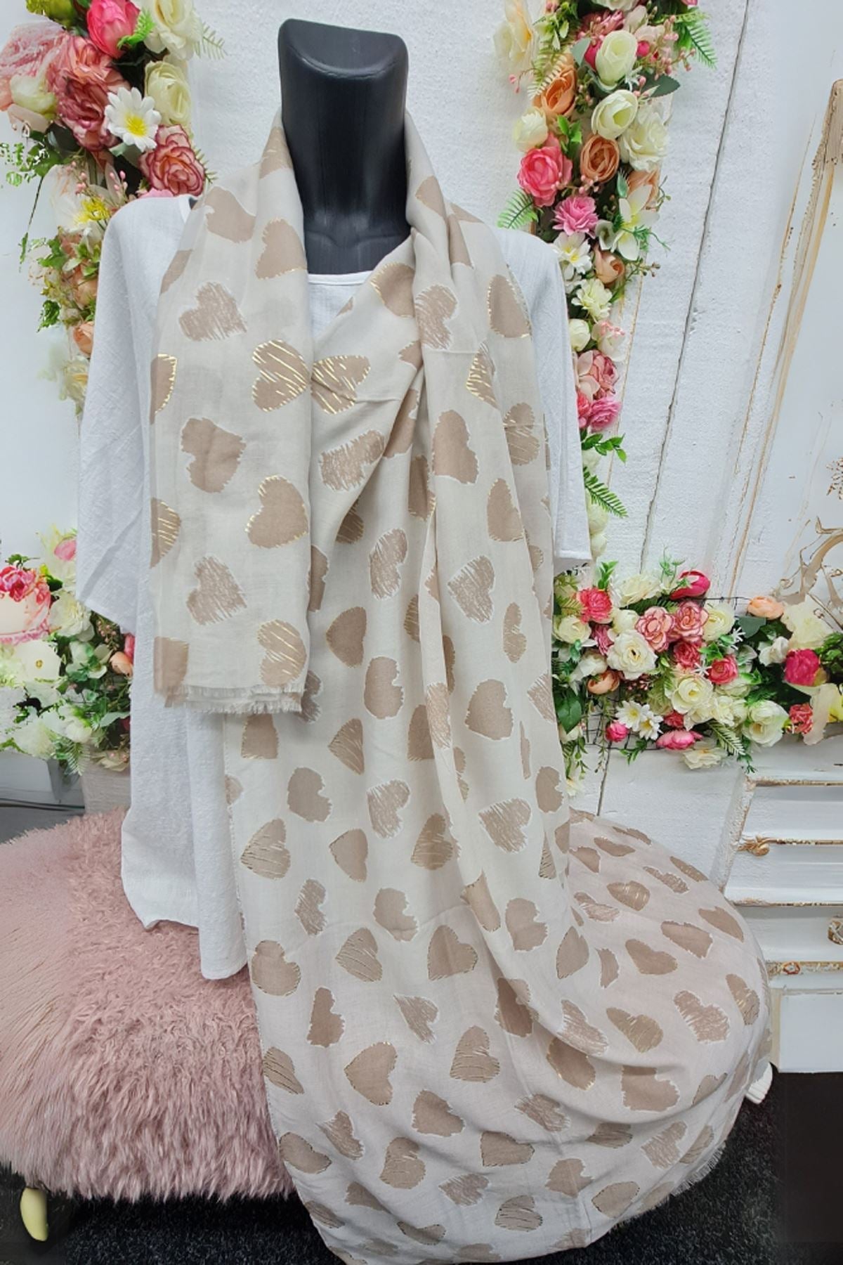 Wrap yourself in elegance with this beautiful beige heart print scarf, a perfect blend of charm and sophistication. Adorned with delicate metallic-accented hearts, this stylish accessory adds a subtle shimmer to your outfit. Made from a soft, lightweight fabric, it drapes effortlessly, offering a breathable and comfortable feel for all seasons. Whether you're dressing up for an occasion or adding a romantic touch to your everyday wear, this scarf is a versatile must-have. With its refined frayed edges and timeless design, it’s ideal for layering over casual or formal outfits. Drape it, wrap it, or knot it for endless styling possibilities.