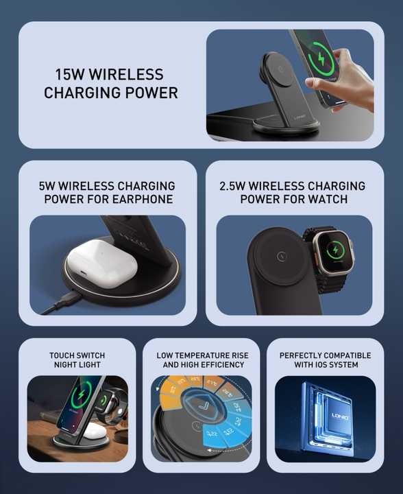 3-in-1 Charging: Supports charging of phone, watch, and earbuds all at once.