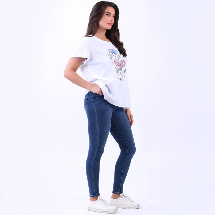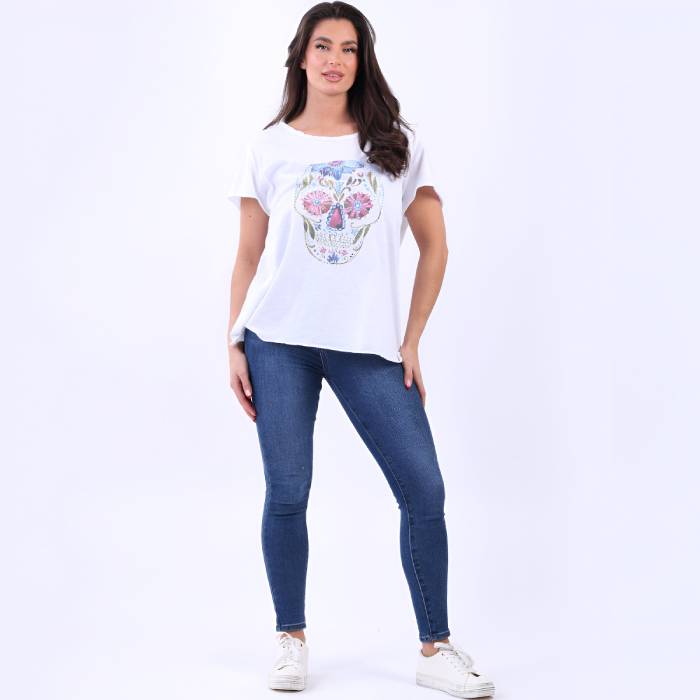 Unique and adventurous with lustful yet stunning Mexican Calaveras sugar skull print that is very popular among women wearers. Made in Italy with finest of the fabric that is high quality and durable cotton, with features with plunging round neckline with baggy plus size fit. The one of a kind floral skull print is easy to mix and match with skinny and acid destroyed denims and platform sneakers.
