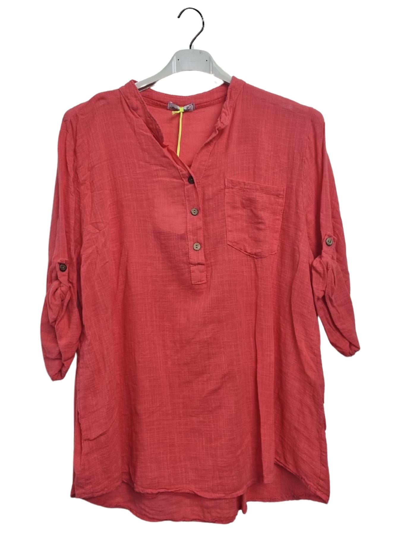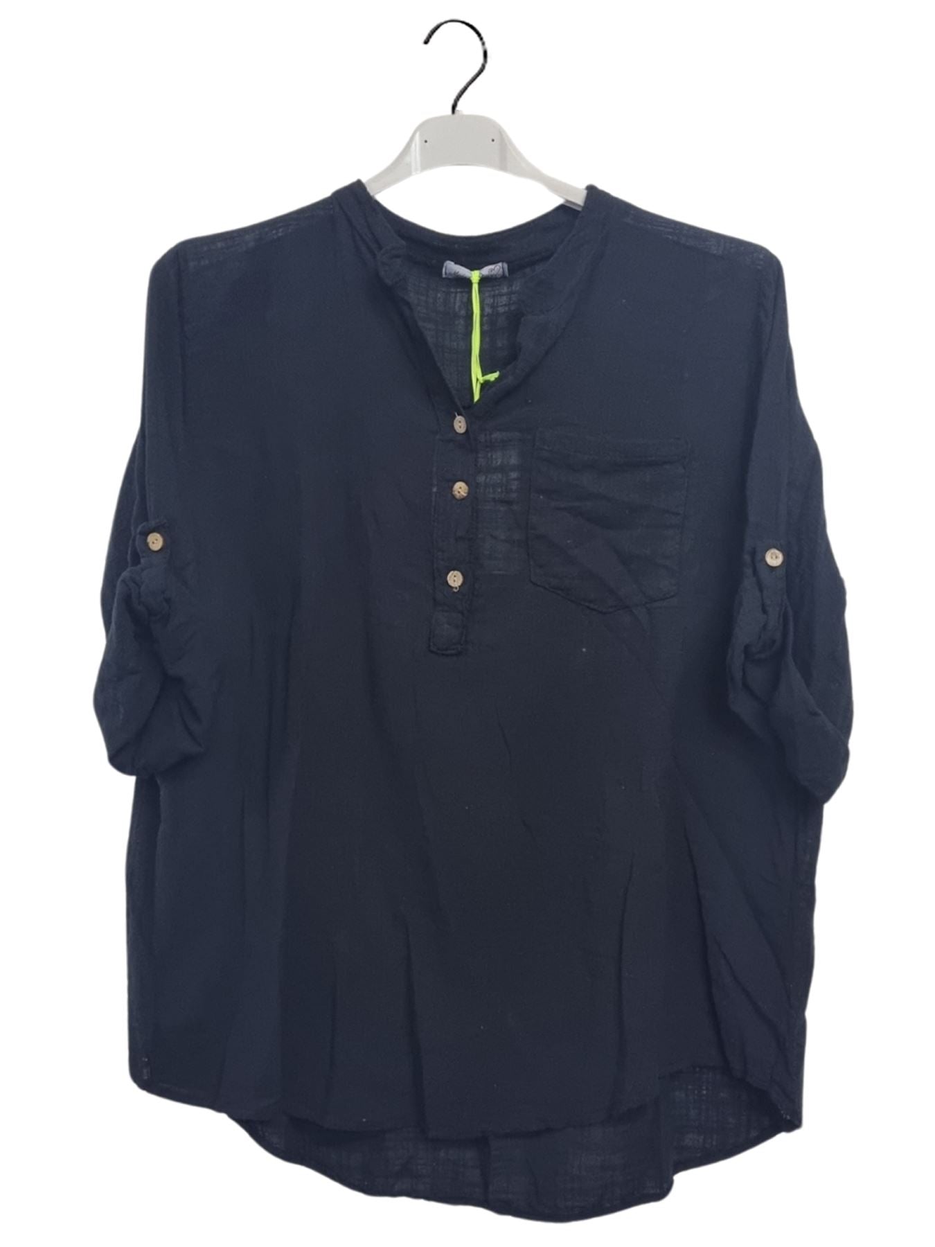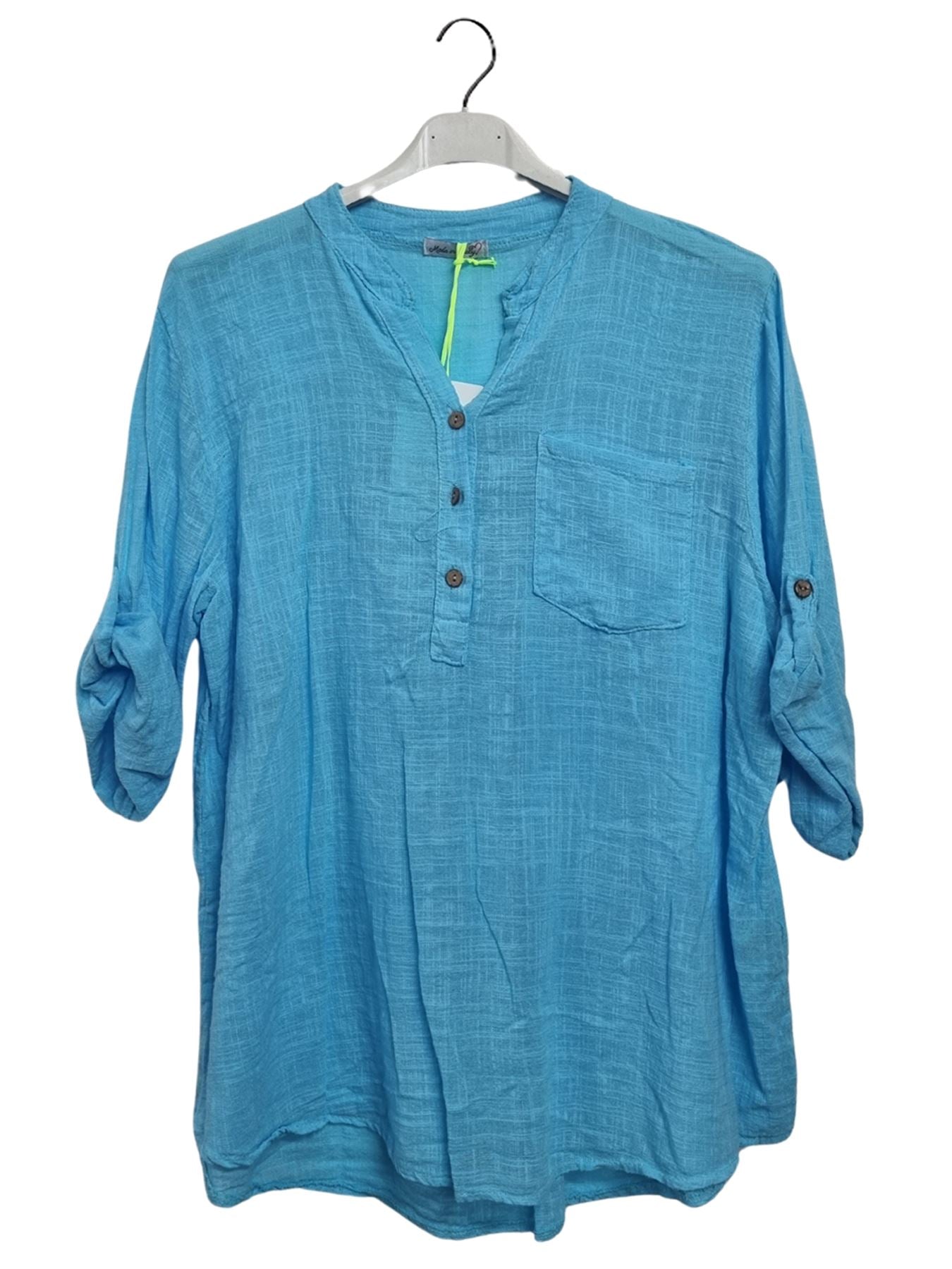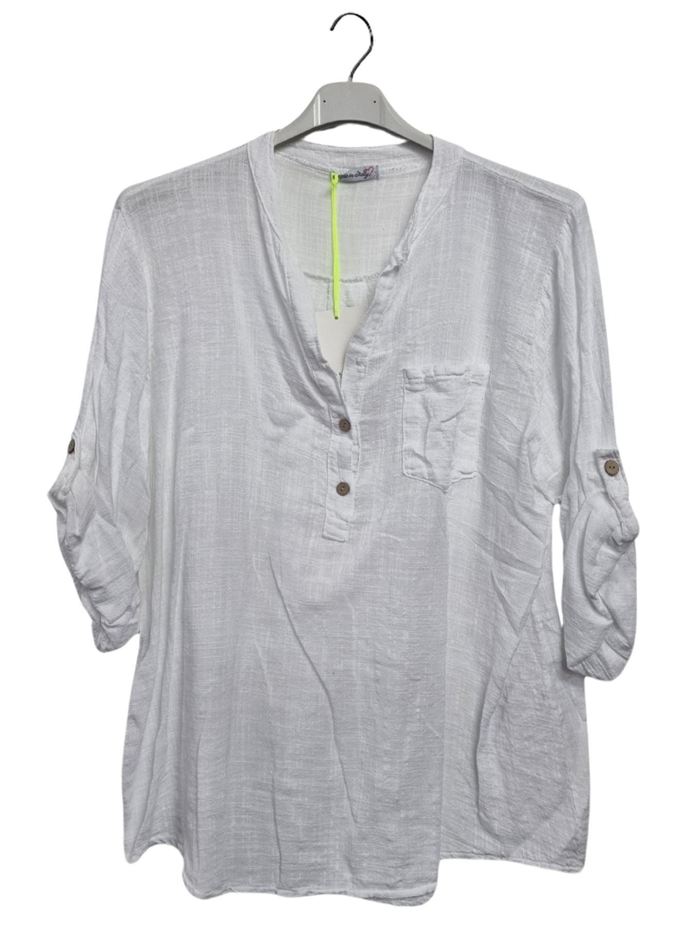 Embrace casual elegance with this Italian cotton tunic blouse, designed for effortless style and all-day comfort. Crafted from premium breathable cotton, this plus-size loose-fit top drapes beautifully, making it ideal for the spring-summer season. Featuring a classic collared neckline, it exudes sophistication, while the chest pocket adds a touch of functionality. The three-quarter sleeves come with buttoned tabs, allowing you to adjust for a relaxed or polished look. A three-button closure at the front adds a stylish accent, making it easy to slip on and off. The versatile plain design ensures it pairs effortlessly with jeans, leggings, or linen trousers for a laid-back yet refined outfit. Whether you're running errands or meeting friends for brunch, this chest pocket tunic blouse is a must-have for your wardrobe. Stay cool, comfortable, and stylish all season long with this timeless Italian piece.