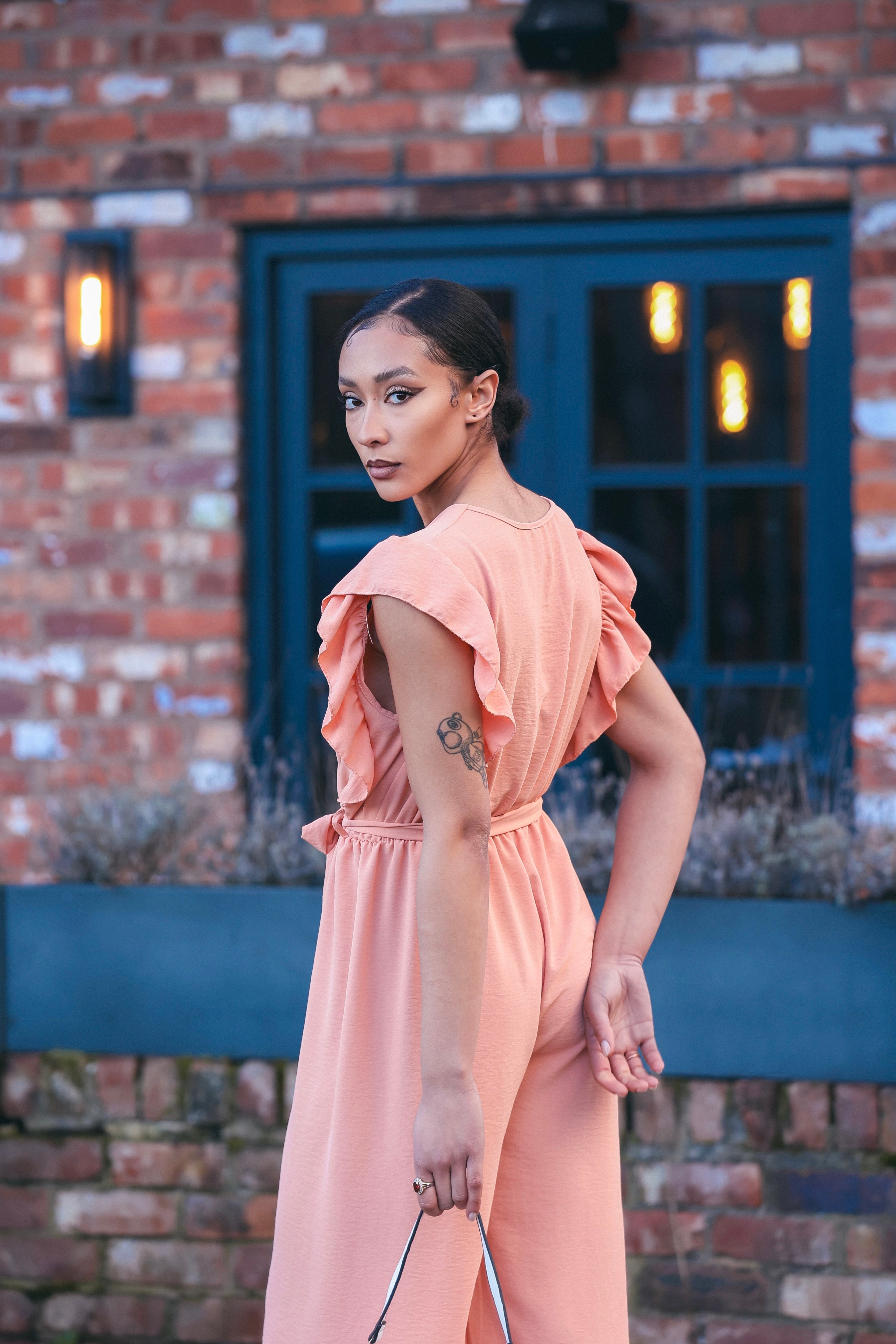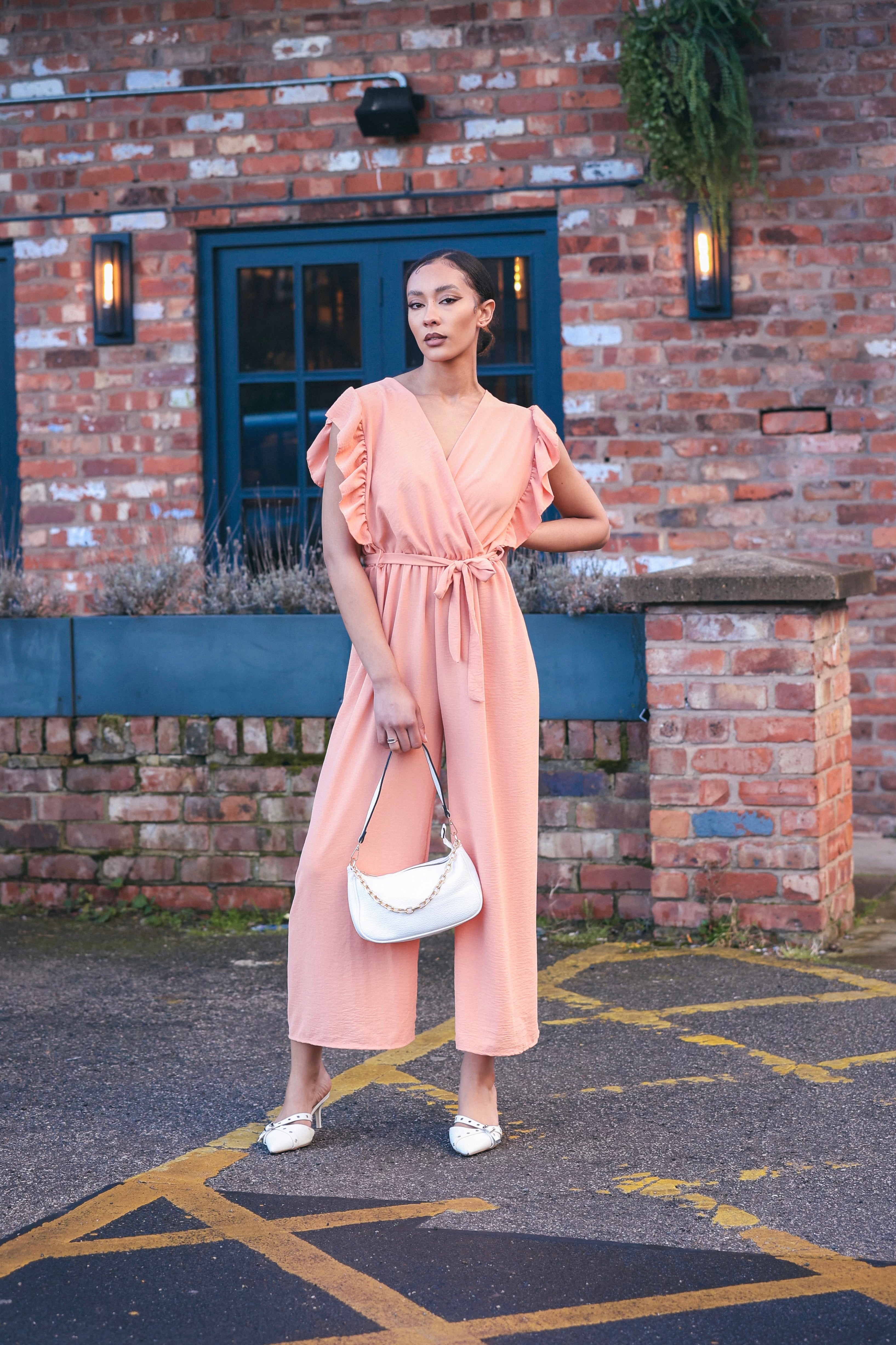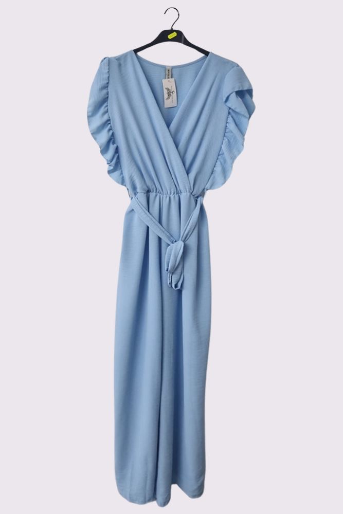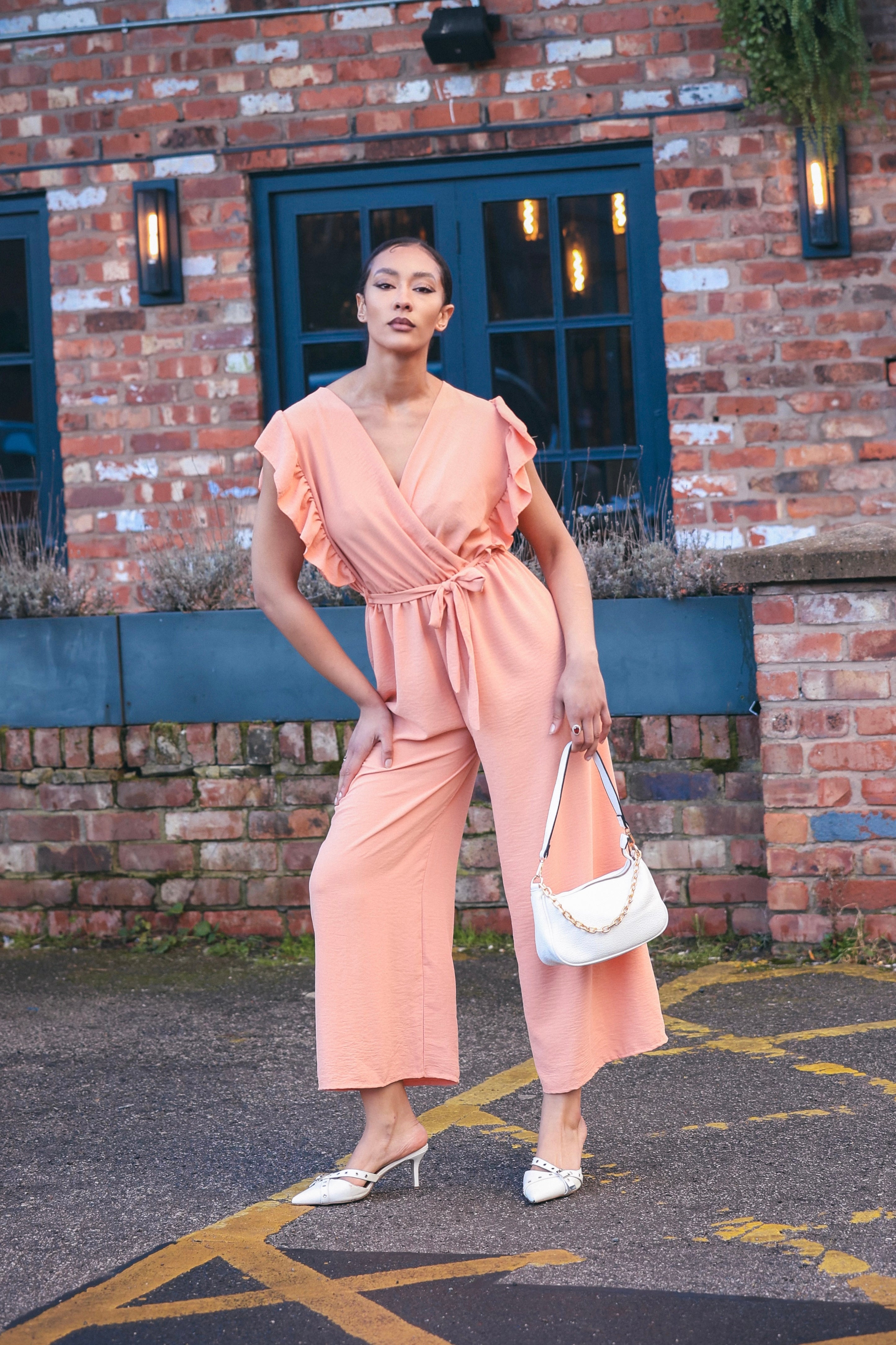 Elevate your wardrobe with our Plain Ruffle Sleeve Wrapover Belted Jumpsuit. Featuring a flattering wrap-over neckline, ruffled sleeves, and a self-tie belt, this jumpsuit effortlessly combines elegance and comfort. Perfect for brunches, casual outings, or daytime events, it adds a chic and sophisticated vibe to your look.