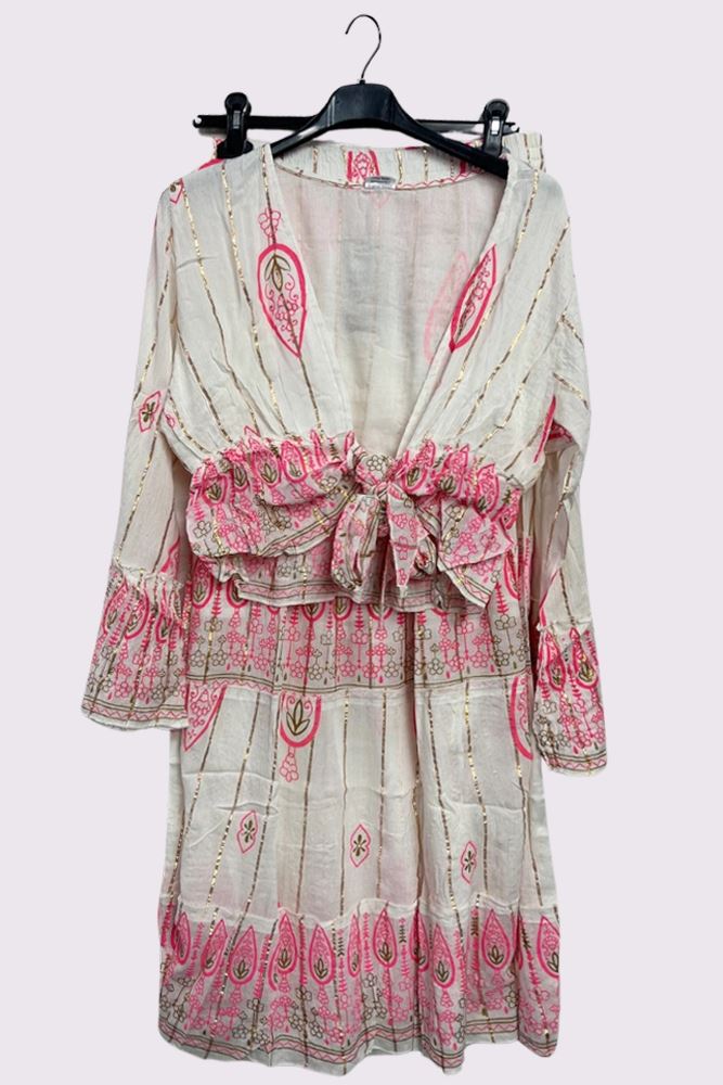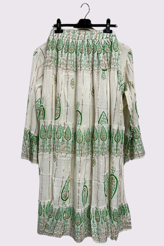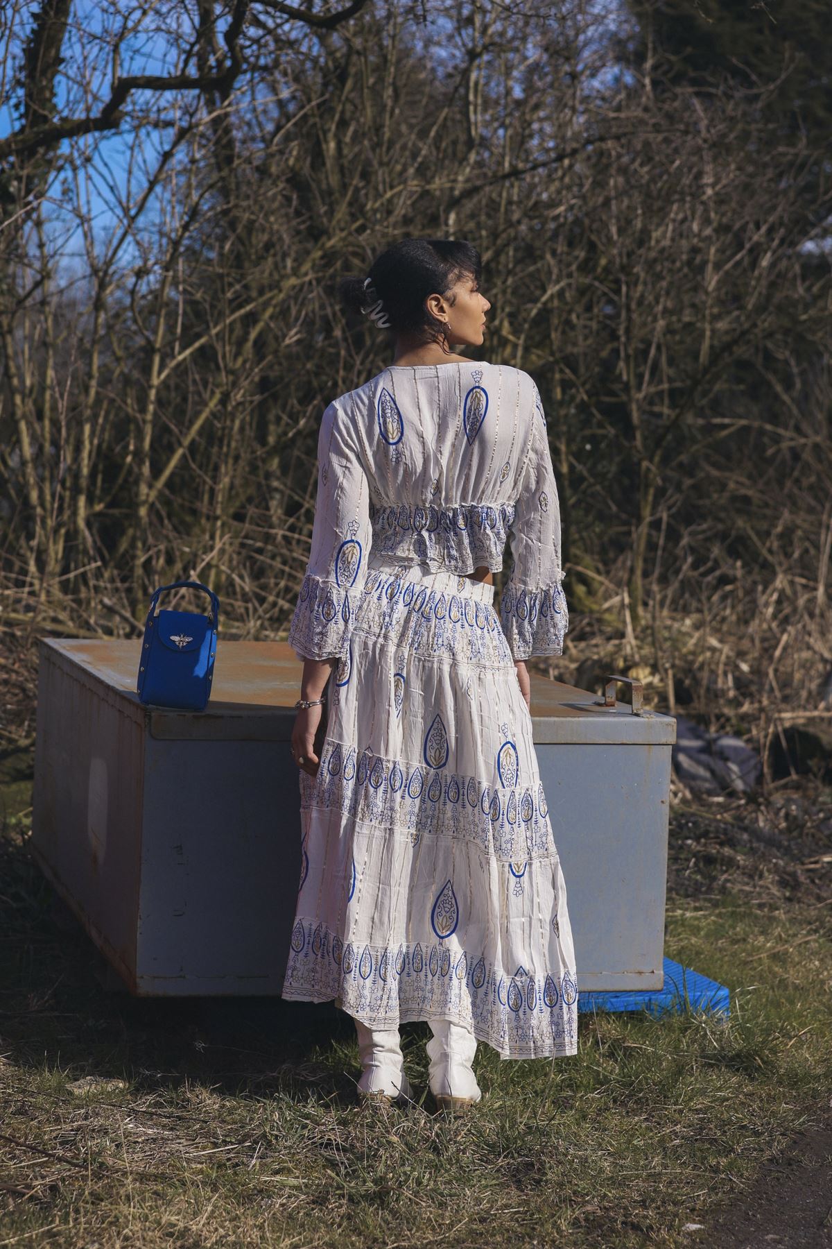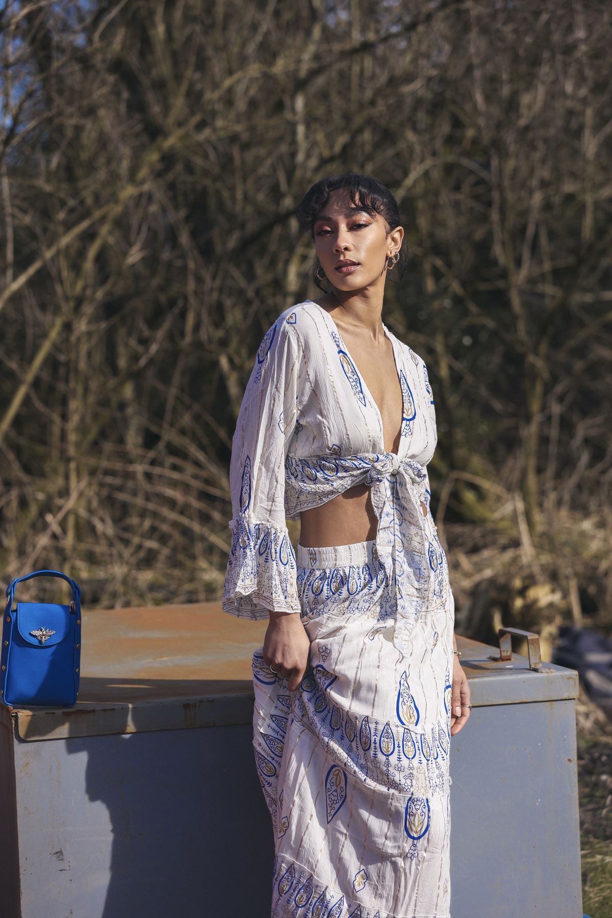 Channel effortless boho chic with our Vintage Print Bohemian Co-Ord Set — the perfect blend of comfort and style. Crafted from soft, breathable viscose, this set features a plunge V-neck crop top with a tie-front detail and flared long sleeves for a flowy, feminine touch. The matching skirt sits comfortably with an elasticated waist and a breezy open hem, creating a loose, plus-size-friendly fit. Subtle rose gold stripe thread detailing adds a hint of shimmer, making this the ultimate spring and summer outfit. Whether you're strolling through a market or heading to a sunset gathering, pair this co-ord with sandals and layered jewelry for a carefree, glowing look.